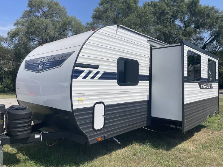 The Ameri-Lite Ultra Lite travel trailers by Gulf Stream are the perfect RV for families wanting to start their camping lifestyle, but not break the bank. These lightweight units are built with a diamond plate lower front, a one-piece synthetic vinyl roof, and a uni-body construction with steel hurricane straps tying the walls to the floor for added durability. The front power hitch jack and four stabilizer jacks will make set-up hassle-free once you arrive at the campground, and you can put out the electric awning to rest in the shade when you're done. Each model includes convenient amenities, like the 13,500 BTU A/C, the tankless water heater, a central control panel, and multiple USB ports for your tablet, phone, and camera! The inside is designed to make you feel at home with radiant LED lighting, designer kitchen backsplash, pleated privacy shades, craft-made cabinetry, plus many more features. Start your RV lifestyle with an affordable, lightweight Ameri-Lite Ultra Lite travel trailer today!