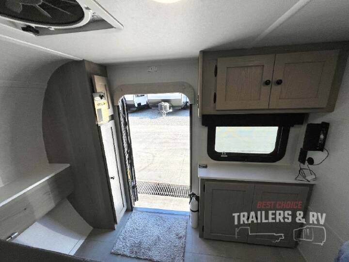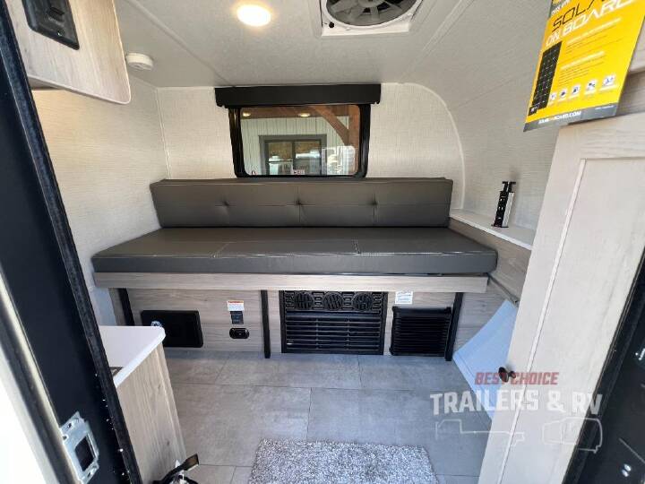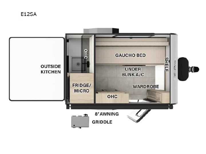 This travel trailer is perfect for those who enjoy the simplicity of tent camping, but also desire a sturdy roof over their head! The gaucho bed provides a comfortable place to lay your head at night. Your bellies can stay full with delicious home cooked meals prepared at the outside kitchen with a griddle, sink, plus a refrigerator and convection microwave. There is storage inside between the wardrobe, the overhead cabinets, and a shelf! With any Flagstaff E-Pro travel trailer by Forest River, you will experience lightweight towing, style and features that will meet your needs, plus amenities that give you more than you expected! Built with interior and exterior composite sidewall construction, tongue and grove plywood flooring, and a vacuum laminated roof and walls, plus torsion axle, Rubber-Ryde suspension, and a tire pressure monitoring system for safety while traveling. And the 200 watt roof mount solar panel with a 1,000-watt inverter will allow you to stay off-grid if you like. The Package E included with models 12SA and 14DA include a Thule power awning, an on-demand water heater, sport tires and wheels, and many more stand-out features!