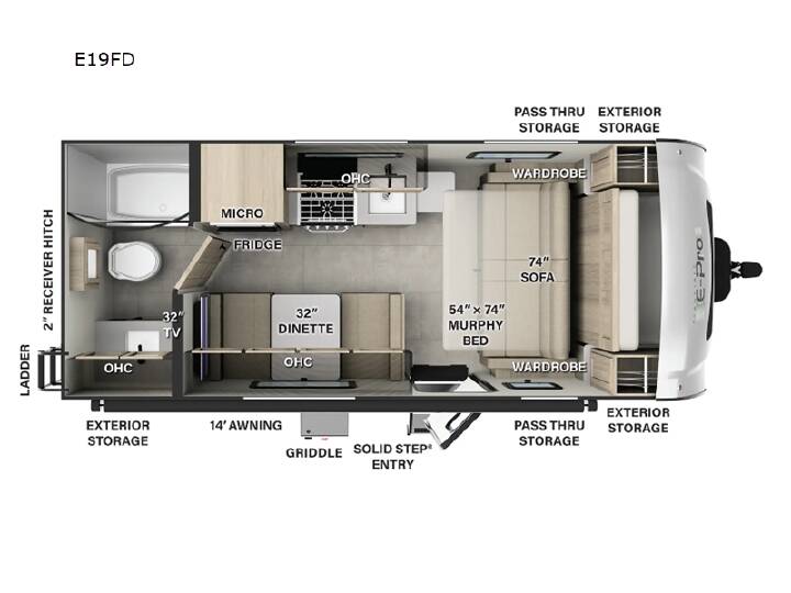 The 2025 Flagstaff E-Pro E19FD is built for campers who want flexibility, comfort, and the freedom to explore off the grid. Up front, the Murphy bed easily converts from a comfortable sofa during the day to a cozy sleeping space at night, maximizing every inch of interior space. The booth dinette provides a perfect spot for meals or planning the next adventure, while the rear full bathroom adds convenience and privacy you ll appreciate on longer trips. The kitchen is equipped with a cooktop, microwave, and 12V refrigerator, making it easy to prep meals wherever you camp, and the outdoor griddle lets you take dinner outside under the 14' power awning.