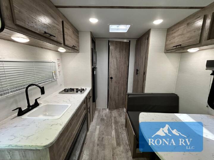 A cozy travel trailer for two or four to enjoy! This unit features a rear bath layout which includes a shower, toilet, and vanity with sink, plus medicine cabinet. No campsite facilities needed! Cook meals and snacks using the two burner cooktop and microwave oven and enjoy eating inside at the booth dinette. When you are not enjoying a meal, the dinette is a great place to play a board game or cards. There is a large closet for clothing storage, and overhead cabinets for your things as well. The front bed is perfect for two, and a nightstand is available for your personal belongings, plus more storage can be found with a large front overhead shelf. This unit even has a fireplace beneath the kitchen sink area!! If you're looking for an affordable, lightweight travel trailer, you've found it in the Ameri-Lite Super Lite by Gulf Stream. These models may be lighter in weight, but they don't skimp out on comfortable features. Each unit includes high-performance vinyl flooring throughout, a white kitchen sink, craft-made cabinetry with designer pulls, plus fabric-wrapped box valances to make you feel right at home. You'll enjoy the 6' 8" interior height, wood ceiling trim, multiple USB ports, and more features included within the Camping Package. These models also include a tankless water heater, a central control panel to control your unit's functions, plus plenty of safety features you are sure to appreciate for your family. You can't go wrong with an Ameri-Lite Super Lite travel trailer. Choose your favorite floorplan today!