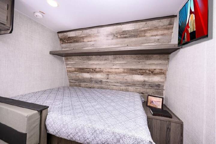 A cozy travel trailer for two or four to enjoy! This unit features a rear bath layout which includes a shower, toilet, and vanity with sink, plus medicine cabinet. No campsite facilities needed! Cook meals and snacks using the two burner cooktop and microwave oven and enjoy eating inside at the booth dinette. When you are not enjoying a meal, the dinette is a great place to play a board game or cards. There is a large closet for clothing storage, and overhead cabinets for your things as well. The front bed is perfect for two, and a nightstand is available for your personal belongings, plus more storage can be found with a large front overhead shelf. This unit even has a fireplace beneath the kitchen sink area!! If you're looking for an affordable, lightweight travel trailer, you've found it in the Ameri-Lite Super Lite by Gulf Stream. These models may be lighter in weight, but they don't skimp out on comfortable features. Each unit includes high-performance vinyl flooring throughout, a white kitchen sink, craft-made cabinetry with designer pulls, plus fabric-wrapped box valances to make you feel right at home. You'll enjoy the 6' 8" interior height, wood ceiling trim, multiple USB ports, and more features included within the Camping Package. These models also include a tankless water heater, a central control panel to control your unit's functions, plus plenty of safety features you are sure to appreciate for your family. You can't go wrong with an Ameri-Lite Super Lite travel trailer. Choose your favorite floorplan today!