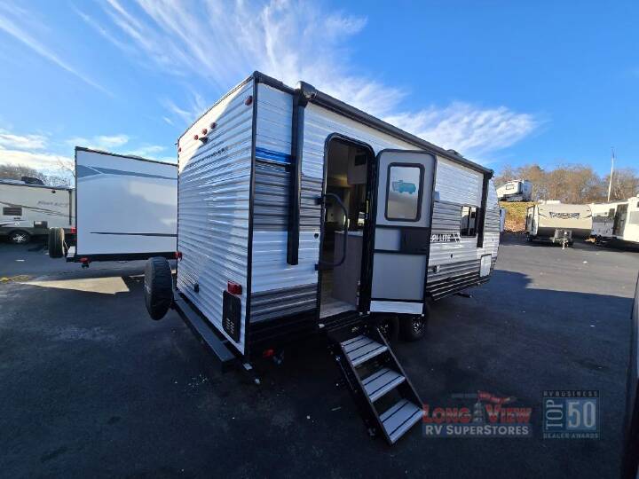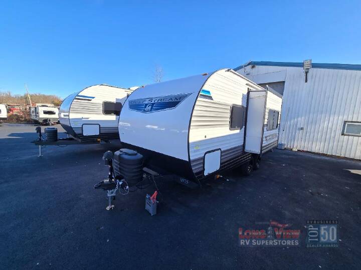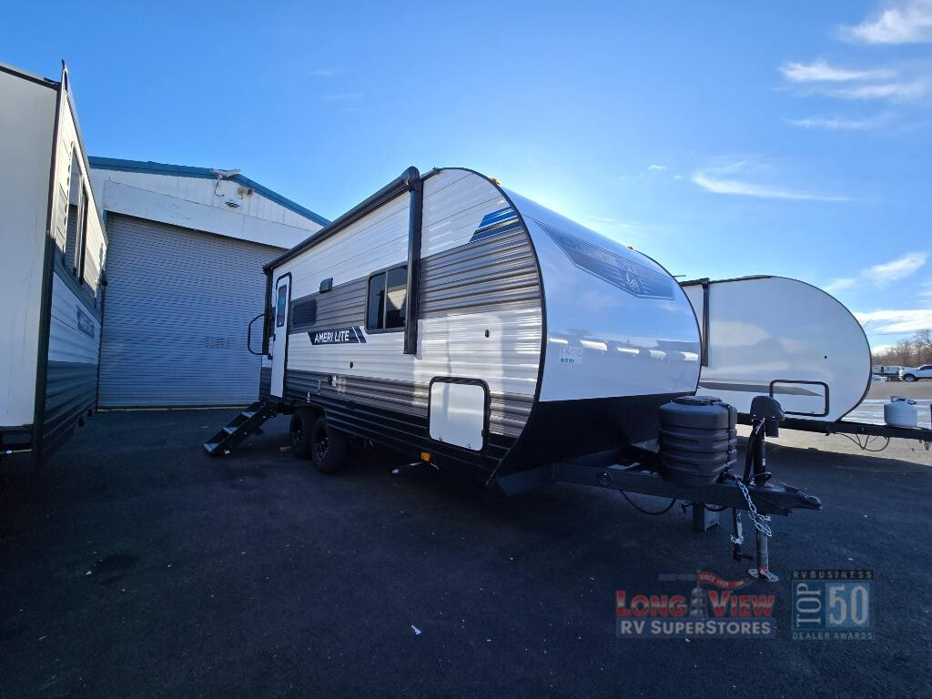 It's time to ditch that old tent and upgrade to this cozy trailer trailer! You will love having your own queen bed to sleep on instead of an air mattress, and you even have dual wardrobes and a nightstand to store your things. And you won't have to use the camp's facilities since there is a full bath in the rear corner. Meals can be made on the three burner cooktop or in the microwave oven, and the 10.7 cu. ft. Everchill refrigerator/freezer included means you won't have to keep food cold in a cooler all weekend. Once dinner is made, you can dine at the jack knife sofa with a folding table, and any guests you may have can sleep here for the night. There is even a slide out for more space; how convenient! The Ameri-Lite Ultra Lite travel trailers by Gulf Stream are the perfect RV for families wanting to start their camping lifestyle, but not break the bank. These lightweight units are built with a diamond plate lower front, a one-piece synthetic vinyl roof, and a uni-body construction with steel hurricane straps tying the walls to the floor for added durability. The front power hitch jack and four stabilizer jacks will make set-up hassle-free once you arrive at the campground, and you can put out the electric awning to rest in the shade when you're done. Each model includes convenient amenities, like the 13,500 BTU A/C, the tankless water heater, a central control panel, and multiple USB ports for your tablet, phone, and camera! The inside is designed to make you feel at home with radiant LED lighting, designer kitchen backsplash, pleated privacy shades, craft-made cabinetry, plus many more features. Start your RV lifestyle with an affordable, lightweight Ameri-Lite Ultra Lite travel trailer today!