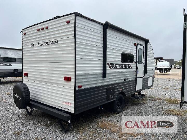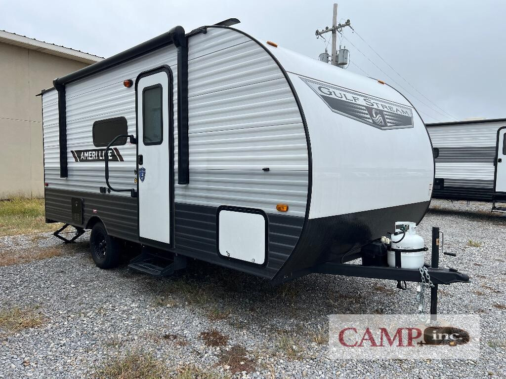 2025 Gulf Stream RV Ameri-Lite Super Lite 177BH, Gulf Stream RV Ameri-Lite Super Lite LE Series travel trailer 177BH highlights: Bunk Beds Two Burner Cooktop Overhead Storage Sleeps Five   It's easier than ever to enjoy the camping lifestyle with this lightweight travel trailer. There are bunk beds for your guests or little ones, a front bed for you, plus a booth dinette that can double as dining and sleeping space. The private toilet and shower will allow you to stay clean throughout each trip, and since the sink is at the kitchen counter, someone can brush their teeth while the other showers before bed. You will love the fireplace included in this model for a more at-home feel, or you just might find yourselves outdoors under the power awning most of the day!   If you're looking for an affordable, lightweight travel trailer, you've found it in the Ameri-Lite Super Lite by Gulf Stream. These models may be lighter in weight, but they don't skimp out on comfortable features. Each unit includes high-performance vinyl flooring throughout, a white kitchen sink, craft-made cabinetry with designer pulls, plus fabric-wrapped box valances to make you feel right at home. You'll enjoy the 6' 8" interior height, wood ceiling trim, multiple USB ports, and more features included within the Camping Package. These models also include a tankless water heater, a central control panel to control your unit's functions, plus plenty of safety features you are sure to appreciate for your family. You can't go wrong with an Ameri-Lite Super Lite travel trailer. Choose your favorite floorplan today!