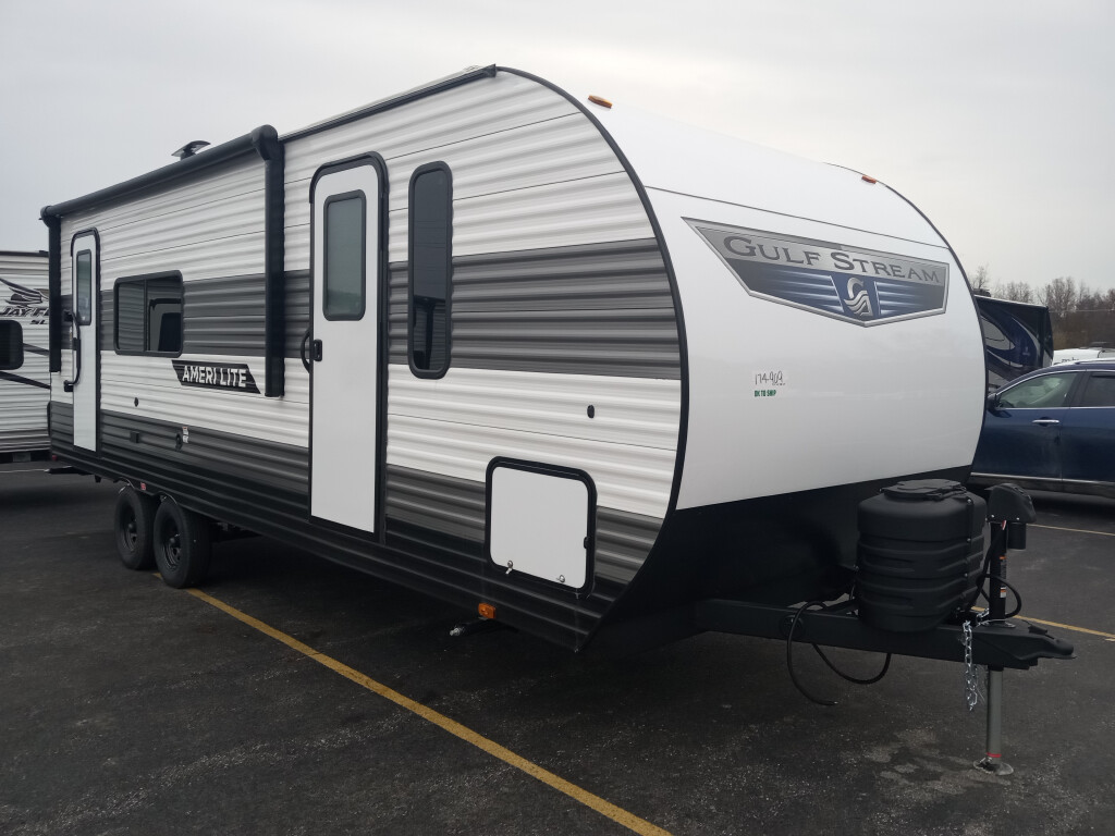 The Ameri-Lite Ultra Lite travel trailers by Gulf Stream are the perfect RV for families wanting to start their camping lifestyle, but not break the bank. These lightweight units are built with a diamond plate lower front, a one-piece synthetic vinyl roof, and a uni-body construction with steel hurricane straps tying the walls to the floor for added durability. The front power hitch jack and four stabilizer jacks will make set-up hassle-free once you arrive at the campground, and you can put out the electric awning to rest in the shade when you're done. Each model includes convenient amenities, like the 13,500 BTU A/C, the tankless water heater, a central control panel, and multiple USB ports for your tablet, phone, and camera! The inside is designed to make you feel at home with radiant LED lighting, designer kitchen backsplash, pleated privacy shades, craft-made cabinetry, plus many more features. Start your RV lifestyle with an affordable, lightweight Ameri-Lite Ultra Lite travel trailer today!