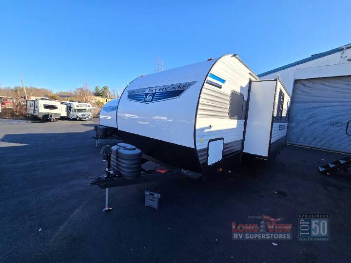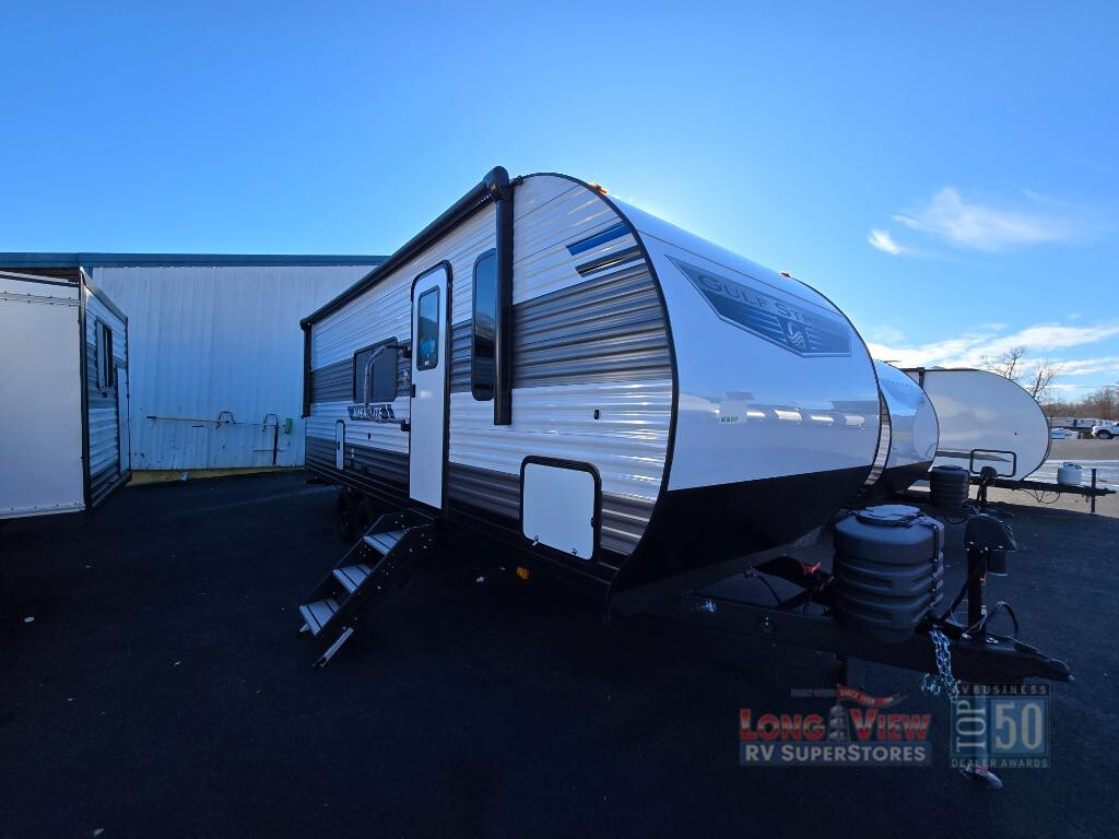 2025 Gulf Stream RV Ameri-Lite Ultra Lite 240RK, Gulf Stream Ameri-Lite Ultra Lite travel trailer 240RK highlights: This travel trailer is perfect for you and your partner, thanks to the queen bed, which is ideal for sleeping and resting peacefully, beside it you will find a shirt closet and wardrobe to store your belongings. You can rest a bit on the theater seating or also have a chit-chat with your partner. Conveniently cook delicious food thanks to the kitchen which includes a refrigerator, three cooktop burners, microwave, and sink. After the food is done, you can comfortably have lunch at the 38' dinette while watching the TV. This unit is also fitted with a lot of space to store different things like pass-thru storage, overhead cabinets, pantry, and linen. Finally, take a relaxing bath in the incredible full bathroom with a skylight above the shower. The Ameri-Lite Ultra Lite travel trailers by Gulf Stream are the perfect RV for families wanting to start their camping lifestyle, but not break the bank. These lightweight units are built with a diamond plate lower front, a one-piece synthetic vinyl roof, and a uni-body construction with steel hurricane straps tying the walls to the floor for added durability. The front power hitch jack and four stabilizer jacks will make set-up hassle-free once you arrive at the campground, and you can put out the electric awning to rest in the shade when you're done. Each model includes convenient amenities, like the 13,500 BTU A/C, the tankless water heater, a central control panel, and multiple USB ports for your tablet, phone, and camera! The inside is designed to make you feel at home with radiant LED lighting, designer kitchen backsplash, pleated privacy shades, craft-made cabinetry, plus many more features. Start your RV lifestyle with an affordable, lightweight Ameri-Lite Ultra Lite travel trailer today!