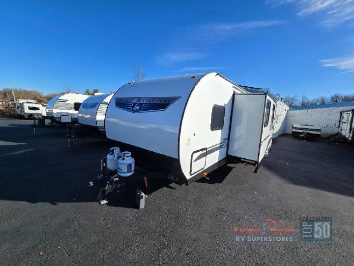 Invite more along with double-size bunks in this 'Show Stopper' travel trailer! The private shower and toilet is close to the bunks if you're camping with little ones making it quite convenient, especially at night. You will be comfortable on the front RV queen bed with dual bedside nightstands and shirt closets. The kitchen features everything you need to create meals and snacks for your entire family, and the outside pass-through storage allows you to easily tuck away your gear like fishing poles, camp chairs and games, plus more! The Ameri-Lite Ultra Lite travel trailers by Gulf Stream are the perfect RV for families wanting to start their camping lifestyle, but not break the bank. These lightweight units are built with a diamond plate lower front, a one-piece synthetic vinyl roof, and a uni-body construction with steel hurricane straps tying the walls to the floor for added durability. The front power hitch jack and four stabilizer jacks will make set-up hassle-free once you arrive at the campground, and you can put out the electric awning to rest in the shade when you're done. Each model includes convenient amenities, like the 13,500 BTU A/C, the tankless water heater, a central control panel, and multiple USB ports for your tablet, phone, and camera! The inside is designed to make you feel at home with radiant LED lighting, designer kitchen backsplash, pleated privacy shades, craft-made cabinetry, plus many more features. Start your RV lifestyle with an affordable, lightweight Ameri-Lite Ultra Lite travel trailer today!