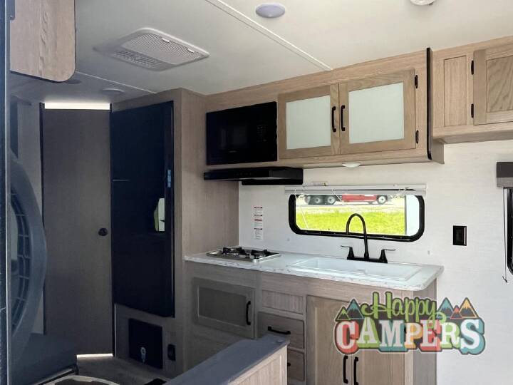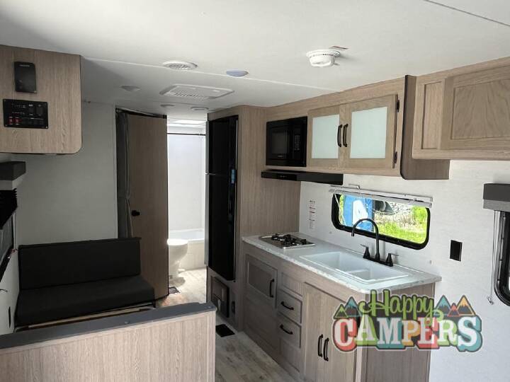 Make your reservations, start planning your menu, and load up your clothes, games, food and more for a fun weekend camping in this 'Show Stopper' trailer! You will have a front private bedroom with a queen-size bed and closets, while your family and friends can choose from the double-size bunks and furniture to sleep on. There is a convertible sofa and a booth dinette, plus a galley kitchen with a microwave oven, sink, plus overhead storage for pots, pans, and dry goods. The rear corner full bathroom offers a tub/shower, toilet, and a sink to be able to get cleaned up in after hiking or relaxing by a fire. The Ameri-Lite Ultra Lite travel trailers by Gulf Stream are the perfect RV for families wanting to start their camping lifestyle, but not break the bank. These lightweight units are built with a diamond plate lower front, a one-piece synthetic vinyl roof, and a uni-body construction with steel hurricane straps tying the walls to the floor for added durability. The front power hitch jack and four stabilizer jacks will make set-up hassle-free once you arrive at the campground, and you can put out the electric awning to rest in the shade when you're done. Each model includes convenient amenities, like the 13,500 BTU A/C, the tankless water heater, a central control panel, and multiple USB ports for your tablet, phone, and camera! The inside is designed to make you feel at home with radiant LED lighting, designer kitchen backsplash, pleated privacy shades, craft-made cabinetry, plus many more features. Start your RV lifestyle with an affordable, lightweight Ameri-Lite Ultra Lite travel trailer today!