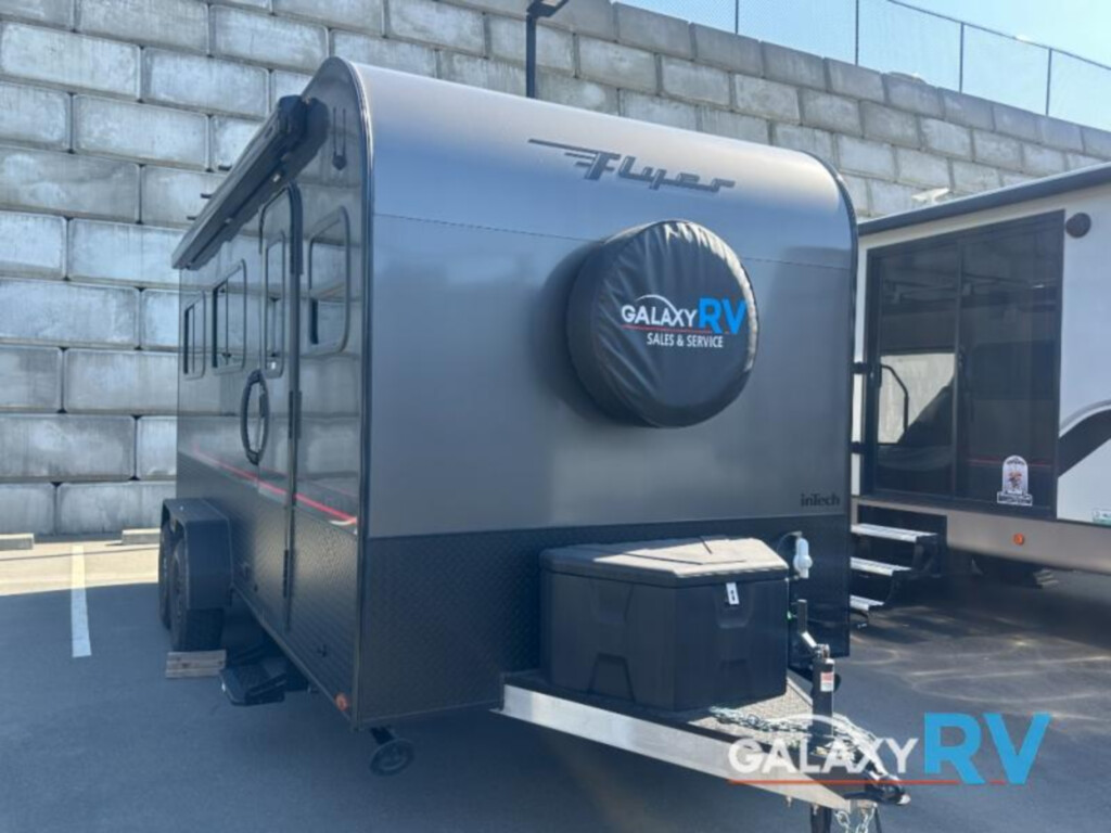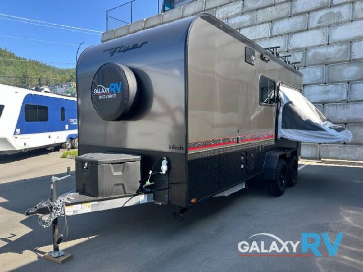 You asked for it and inTech RV delivered with this toy hauler expandable! You will enjoy some of the same features as the Discover model, but will also appreciate a wet bath in the Forge. There is a porcelain toilet, aluminum walls with a sealing exterior door so you don't need a shower curtain, storage space, and even a bath roof vent with an onboard switch! The kitchen includes everything you need to cook meals each day, including a two burner cooktop, a large farmhouse sink, and a spacious 8 cu.ft. 12V refrigerator! The 80" x 160" garage floor space features durable black coin flooring and is large enough to bring in most side-by-sides, plus there are tie-downs to keep your toys secure. For sleeping space, you'll find a tip-out bed and a standard sleeper sofa, and if you have more campers tagging along, you can add the optional drop-down bunk, or even bring your own air mattress! A few more stand-out features you'll love on the Forge are the on-demand LP water heater, the aluminum walk-on roof, tinted windows, and Airline Track sidewall tie-down area! The dry weight for this model ranges from 3,845 lbs. - 4,300 lbs., and the carrying capacity ranges from 2,700 lbs. - 3,155 lbs. The inTech RV Flyer travel trailers and toy hauler expandables are ready for adventure whenever you are! With the all-aluminum, all-tube cage frame, the Flyer has been built with lightweight and long-lasting materials so that you can enjoy your unit for many, many years. The Flyer has a rugged design so that you can confidently explore new territory and go where traditional RVs cannot. The Flyer has a 2" rear receiver rated for 175 pounds which allows you to bring along your bikes, and the Bluetooth stereo has two speakers you can always have your best music playing. The optional roof rack will allow you to bring along kayaks, and there are more available options depending on the model you choose.