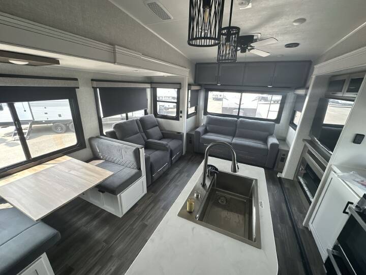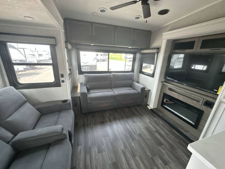 This Fifth-Wheel sleeps 8 people and is available at Camping World in Scott CIty, MO.