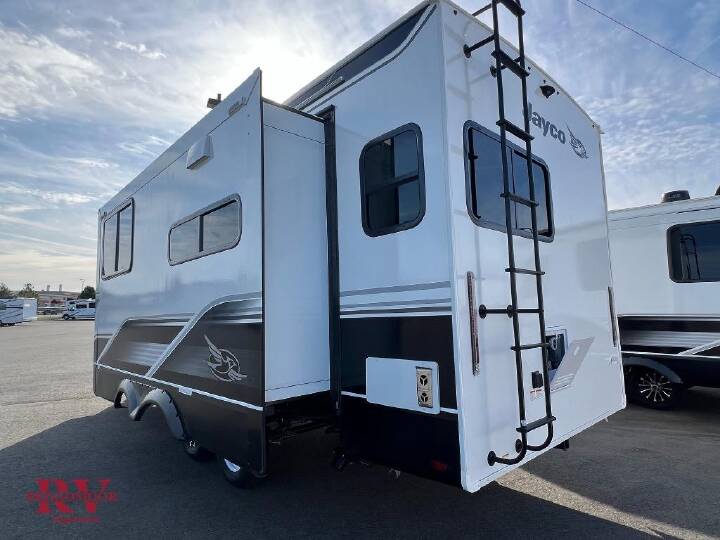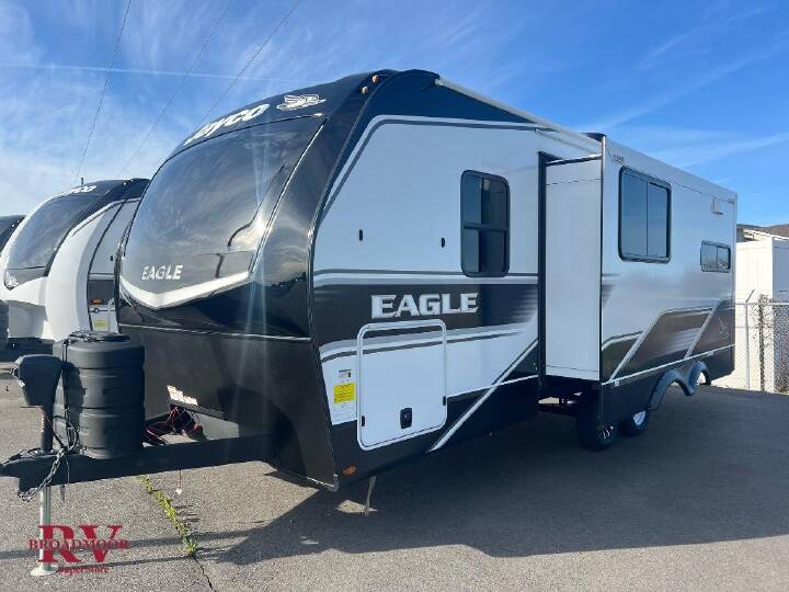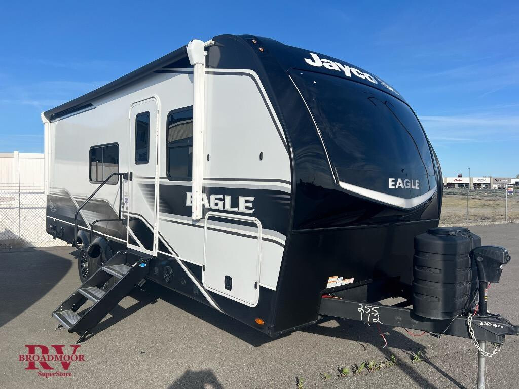 Optional Equipment Installed On This Unit: Customer Value Package, Luxury Package, Four Star Handling Package, Overlander I Solar Package It will be so easy to enjoy camping trips when you're in this travel trailer! A full kitchen, complete with a three burner cooktop, over-the-range microwave, and 10 cu. ft. 12V refrigerator will let you cook and store meals, and the booth dinette provides a place to dine. Within the large slide, you'll find the 60" theater sofa with cup holders which is across from the 40" 4K Ultra LED HD Smart TV! You'll love having a 66" x 80" Olympic queen bed to sleep on, and there are dual wardrobes to keep your clothes organized. And larger camp gear can go outside in the pass-thru storage! With any Eagle HT fifth wheel or travel trailer by Jayco you will enjoy a smooth drive thanks to the 4 Star Handling Package, Goodyear Endurance tires, and MORryde CRE-3000 rubberized suspension. The Customer Value Package includes amenities that are sure to make camping easier than ever, like the 60K on-demand water heater, Keyed-Alike lock system, 15,000 BTU "Whisper Quiet" A/C, and more. Handcrafted and glazed door/drawer fronts will make your space feel more like home, along with residential vinyl flooring throughout, GE appliances, and blackout roller shades with reflective side throughout to keep the sun out when you want to sleep in. Each model also includes a NuVo H2O water treatment system with filters included, interior and exterior "Blue Sync" audio connect with MB Quart Sound for your TV and phone, and 100% no floor vents for added comfort and convenience!
