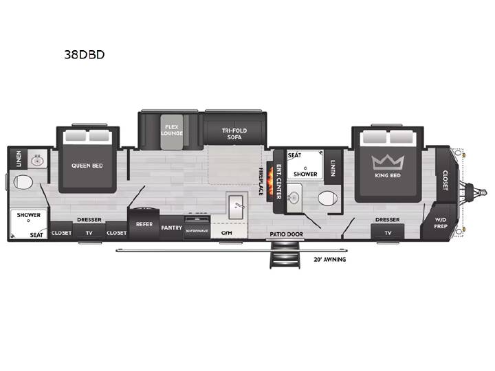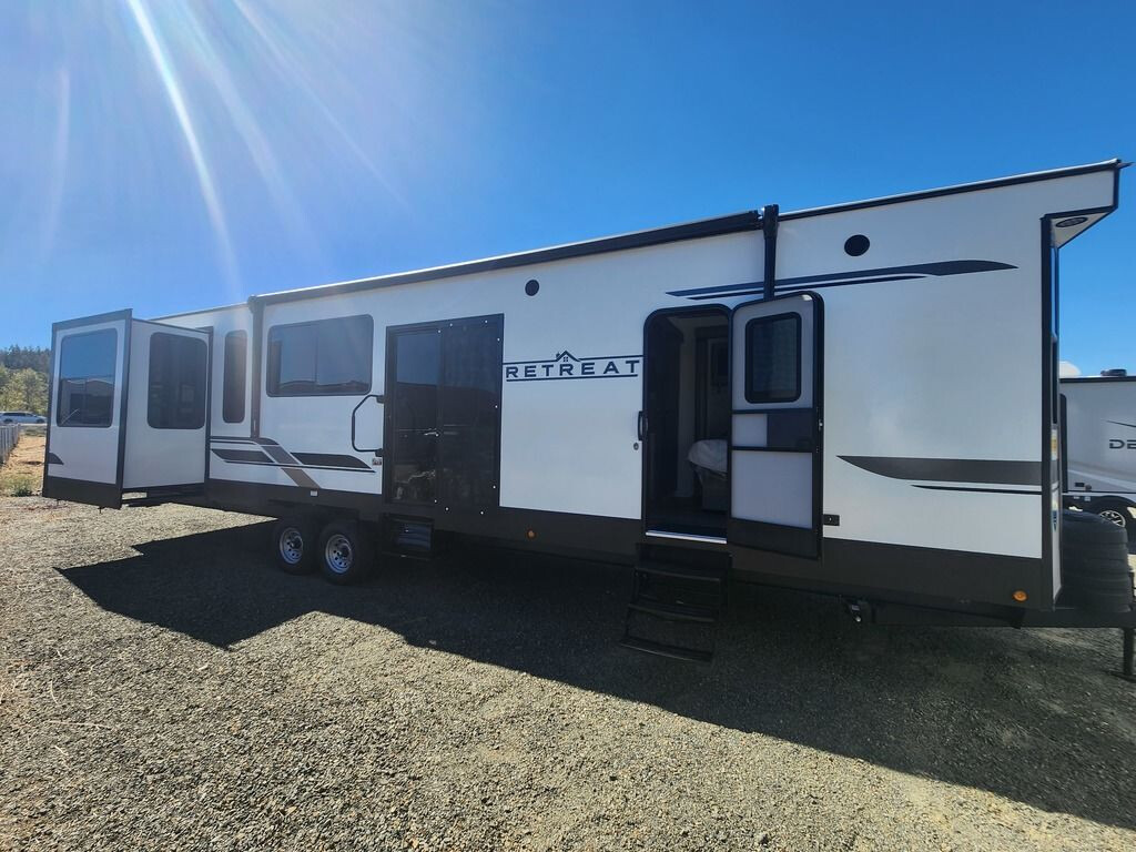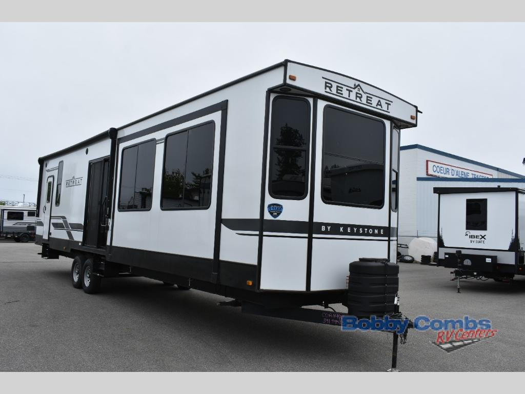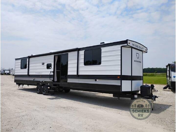 Extended stays are easy in this spacious destination trailer. Since there are two private bedrooms and two full baths, you can camp with family and friends, plus there are triple slides for more space! The front bedroom includes a king bed slide out, a closet, dresser, plus washer and dryer prep if you choose to add those appliances. The master bedroom towards the back features a queen bed slide, dual closets, and a full rear bath, and both bathrooms includes a shower with a seat for more comfort! Everyone can meet in the combined kitchen and living area to relax on the tri-fold sofa, play a game at the flex lounge, or just enjoy the 50" TV and fireplace. And the full kitchen is sure to impress with its three burner gas oven, air fryer microwave, and 16 cu. ft. refrigerator! The Keystone Hideout destination trailers will be just what the doctor ordered for a stress-free holiday at your favorite campsite! There are a few exclusive features that you'll only find on a Keystone product, like the color-coded unified wiring, the Tuf-Lok thermoplastic duct joiners, the in-floor heating ducts, and the Tru-fit slide construction. Each model has a power awning for some shade in the afternoon, and the tinted safety glass windows will prevent the harmful UV rays from getting inside. You'll also have blackout night shades that you can close when you want privacy and one-piece pressed countertops that will be easy to keep clean.