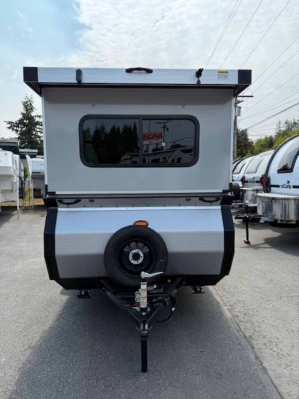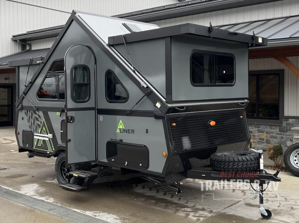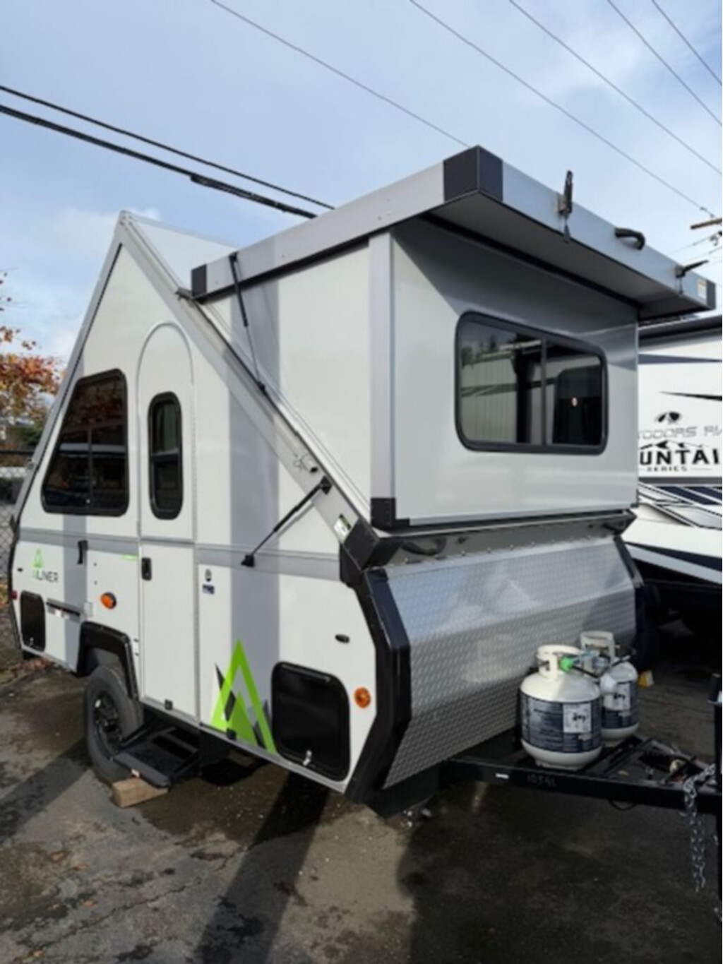 The Evolution A-frame camper by Aliner is coming to you with residential features and solid construction materials. You'll love the slate gray exterior, aluminum wheels, and the Azdel composite panels to help prolong the life of your camper. There are LED running lights, exterior baggage doors, and four stabilizer jacks to help keep your camper secure. You will also appreciate the keyless entry, the dual LP tanks with a cover, and the 200-watt solar panel on the front dormer for some off-grid power. The lift kit and 15" off-road tires add 3" to the height, allowing you to explore more roads, and you'll find many interior comforts to make you feel right at home!