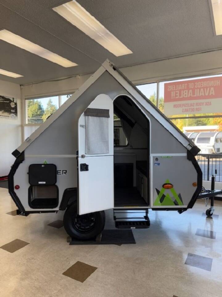 Don't wait another minute, head to the campground in this camper today! There is a two-burner cooktop to make lunch on and a 3.2 cu. ft. 12V refrigerator for your cold items. The sofa bed converts to a queen-size bed, and the dinette also converts to a queen-size bed. You'll find storage space for your items, and there is a 32" x 32" hidden shower under the dinette so you can clean up each day. This model also has a dry weight of 2,400 lbs. for easy towing! The Evolution A-frame camper by Aliner is coming to you with residential features and solid construction materials. You'll love the slate gray exterior, aluminum wheels, and the Azdel composite panels to help prolong the life of your camper. There are LED running lights, exterior baggage doors, and four stabilizer jacks to help keep your camper secure. You will also appreciate the keyless entry, the dual LP tanks with a cover, and the 200-watt solar panel on the front dormer for some off-grid power. The lift kit and 15" off-road tires add 3" to the height, allowing you to explore more roads, and you'll find many interior comforts to make you feel right at home!