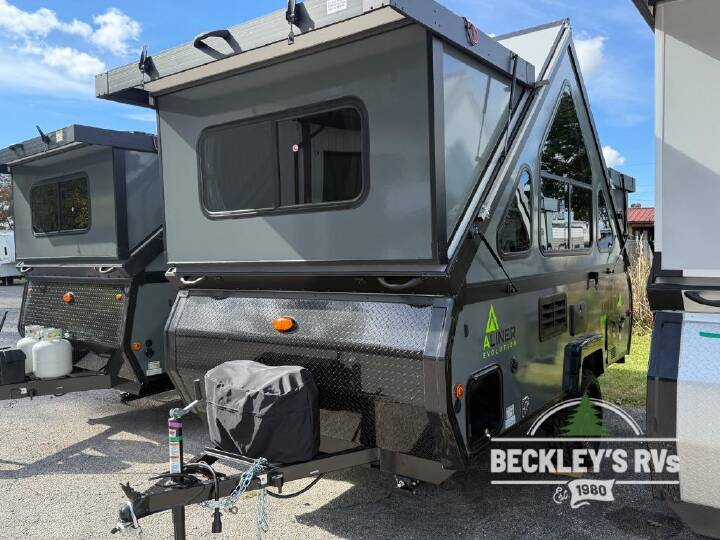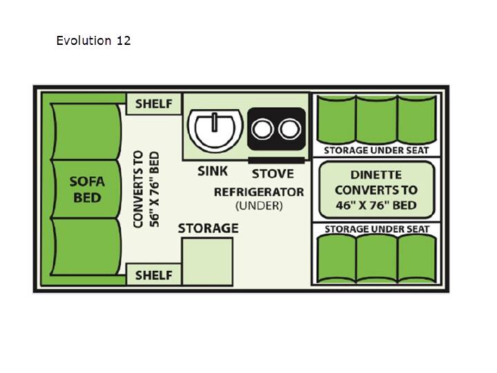 If you're looking for a lightweight camper that can sleep four, take a look at this Evolution 12! There is a sofa bed in the back that will convert to a 56" x 76" bed each night, and the shelves let you store your belongings. The dinette with bed conversion provides a place to dine each day, and a 46" x 76" bed at night. In the morning you can prepare breakfast on the two burner stove, clean up with the flush mount sink, and store cold items in the 3.0 cu. ft. 3-way refrigerator with a freezer. And you can even add an optional outside grill to keep fried food odors outdoors! The Evolution A-frame camper by Aliner is coming to you with residential features and solid construction materials. You'll love the slate gray exterior, and the Azdel composite panels included help prolong the life of your camper. There are 15" off-road tires with graphics package, LED running lights, exterior baggage doors, plus many more exterior conveniences. The Evolution A-Frame camper comes with commercial grade, raised coin polyvinyl flooring, SIMONA BOATBOARD interior cabinets and furniture, and three indoor electrical outlets to name a few interior comforts. 1987/3000; FRONT HARD DORMER; GRAPHICS; REAR HARD DORMER; RVIA