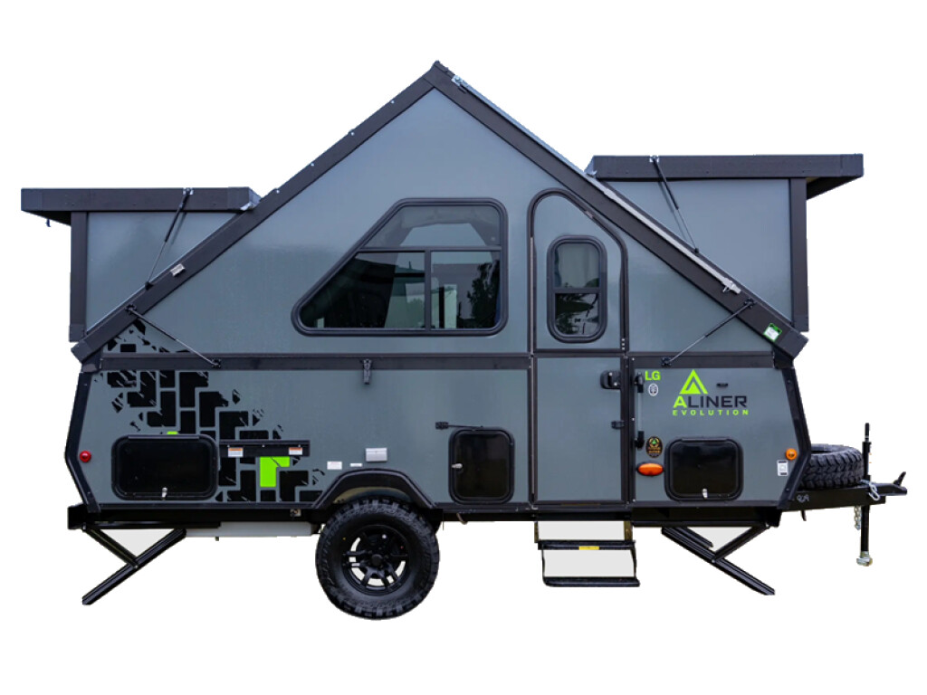 You'll love the amount of convenience and comfort found in this A-frame camper! There is a booth dinette up front that convert to a 40" x 80" bed, along with a rear sofa that converts to a 60" x 80" queen-size bed. Prepare your best meals on the two-burner cooktop, use the sink to clean up, and store cold items in the 3.2 cu. ft. 12V refrigerator. This unit also includes a 200-watt solar panel on the front dormer, and an optional 200-watt solar panel can be added to the rear dormer for even more off-grid capabilities! The Evolution A-frame camper by Aliner is coming to you with residential features and solid construction materials. You'll love the slate gray exterior, aluminum wheels, and the Azdel composite panels to help prolong the life of your camper. There are LED running lights, exterior baggage doors, and four stabilizer jacks to help keep your camper secure. You will also appreciate the keyless entry, the dual LP tanks with a cover, and the 200-watt solar panel on the front dormer for some off-grid power. The lift kit and 15" off-road tires add 3" to the height, allowing you to explore more roads, and you'll find many interior comforts to make you feel right at home! GRAPHICS; FRONT HARD DORMER; REAR HARD DORMER; RVIA