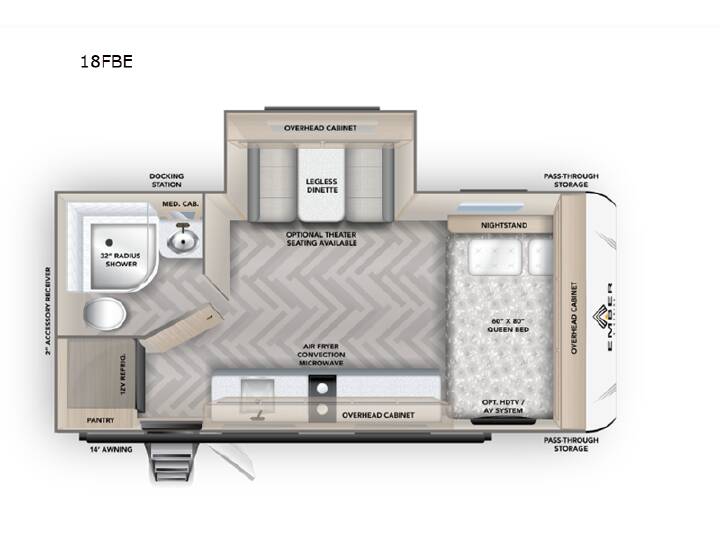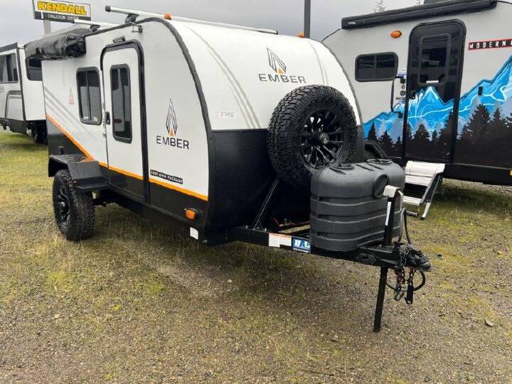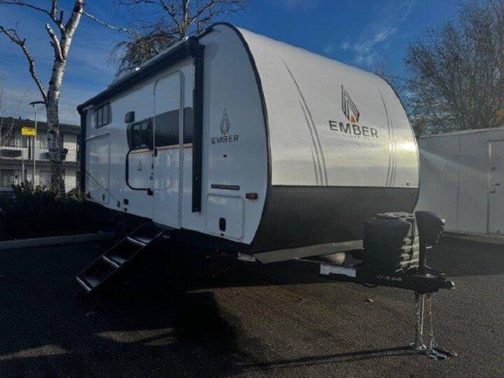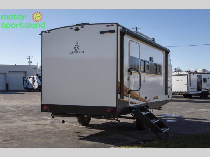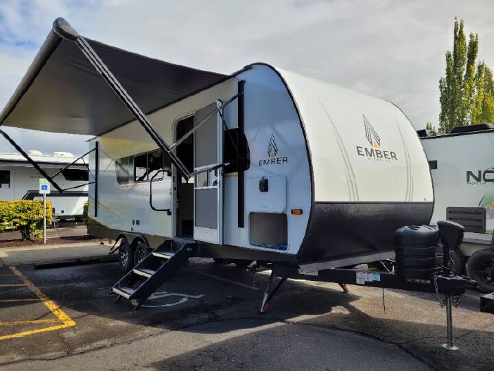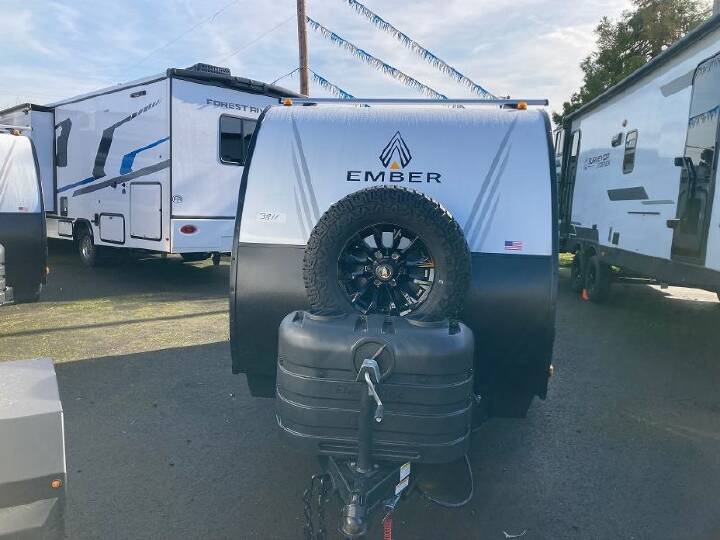 Time at the campground in this travel trailer will be time well spent. Once you arrive at your destination, you can put out the 14' electric awning, unpack the pass-through storage, then head inside for lunch. There is an air fryer convection microwave plus a dual burner cooktop to make meals each day, and the 10 cu. ft. 12V refrigerator will keep your food fresh. A legless dinette slide provides a place to dine together and even let a guest sleep over. If you're not needing the extra sleeping space, just choose the optional theater seating! You'll find the front queen bed will give you a great night's rest, and there is a full bath on board that will allow you to freshen up each morning. With any E-Series travel trailer by Ember RV you will enjoy a lightweight RV with all the "Essentials" needed for memorable trips in the great outdoors! Each model is constructed with durable laminated Azdel Onboard composite walls, a full walkable roof with a one-piece Tufflex PVC roofing material, and a gel-coated fiberglass exterior. The Dexter axles with E-Z lube hubs and forward self-adjusting electric brakes plus Goodyear Endurance tires will provide a smooth tow from home to campground. You will appreciate the Congoleum DiamondFlor "carpetless" interior that is easy to clean, and the hardwood framed cabinet doors will create a more residential feel. Each model includes a tankless on-demand water heater for endless hot showers and an 18,000 BTU Max Cool "Whisper Quiet" A/C, which is the largest single A/C in its class! If you're looking for off-grid capabilities, you might want to choose the optional Off-Grid Solar Package with 400 total watts of solar panels, a 2,000W Pure Sine wave inverter, and a Victron MPPT solar controller!