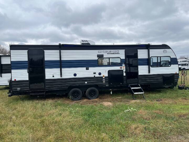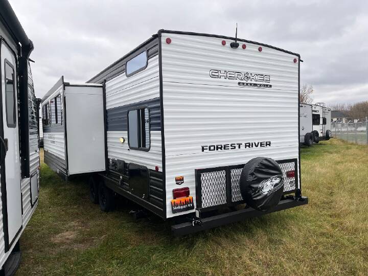 Come on inside this Cherokee Grey Wolf travel trailer and experience the convenience of a smooth flow of traffic in and out with two entry doors. The rear door leads into a full bath which is great for accessibility. Once inside, you will notice the large U-shaped dinette and the sofa which sit on the slide and create a spacious footprint for moving about, as well as great places to play games and socialize with your friends and family. A walk-in pantry provides plenty of storage allowing you to stock up on your favorite snacks and dry goods for your family adventure. At night, there is sleeping space for everyone between the double-size bunks and the RV king bed, plus the furniture. The Cherokee Grey Wolf by Forest River feature distinctive features, at-home comforts, and durable construction materials so you can enjoy your RV for years to come, plus they are outstandingly affordable! You can choose between travel trailers, toy haulers, and even fish houses, depending on the camping style you prefer. You'll find many convenient amenities both inside and outside, along with comfortable seating and sleeping spaces, and plenty of storage for your personal belongings and camp gear!