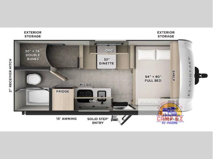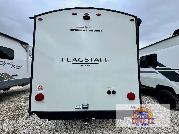 This charming travel trailer is perfect for families or small groups. The front bedroom features a full bed, perfect for a restful night's sleep. Ample storage space ensures you stay organized and clutter-free. The booth dinette is a cozy spot for meals and conversation, while the kitchen area is equipped with a microwave, fridge, and overhead cabinets. Prepare delicious meals and snacks with ease. The bunk beds provide a fun and practical sleeping solution for kids or additional guests. Perfect for sleepovers or family gatherings! The full bathroom is a convenient and refreshing space, with all the essentials for a comfortable stay. With any Flagstaff E-Pro travel trailer by Forest River, you will experience lightweight towing, style and features that will meet your needs, plus amenities that give you more than you expected! Built with interior and exterior composite sidewall construction for added strength and durability, a fully laminated roof for weather-tight protection, and aluminum truss roof bracing for enhanced stability. These trailers are equipped with Dexter leaf-spring axles for smooth towing and durable performance. The interior features an aluminum dinette, bed, and bunk, providing a strong and lightweight framework for comfortable living. Additionally, the backup camera prep ensures a safe and stress-free reversing experience. Make your selection today!