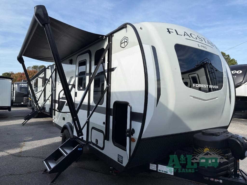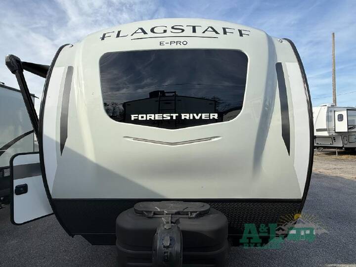 This can be the perfect couples trailer for you or your own RV with more floor space to move around thanks to the slide out sofa with a 30" x 15" table which offers sleeping space for friends. You will have a queen bed to lay your head up front, and everyone can watch the 12V TV. The wardrobe and overhead cabinets give you clothing storage, and the kitchen cooktop and microwave allow the cook to make warm meals. And the 12V refrigerator is conveniently next to the entry so you can grab a drink on your way out to relax under the 11' power awning. With any Flagstaff E-Pro travel trailer by Forest River, you will experience lightweight towing, style and features that will meet your needs, plus amenities that give you more than you expected! Built with interior and exterior composite sidewall construction for added strength and durability, a fully laminated roof for weather-tight protection, and aluminum truss roof bracing for enhanced stability. These trailers are equipped with Dexter leaf-spring axles for smooth towing and durable performance. The interior features an aluminum dinette, bed, and bunk, providing a strong and lightweight framework for comfortable living. Additionally, the backup camera prep ensures a safe and stress-free reversing experience. Make your selection today!