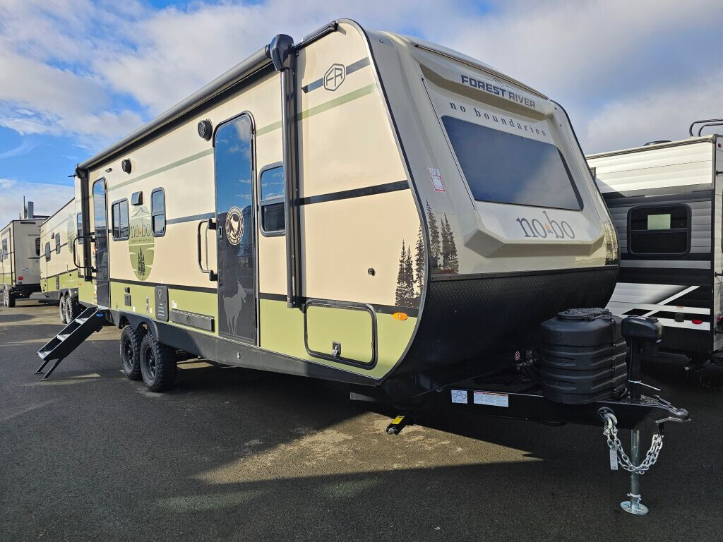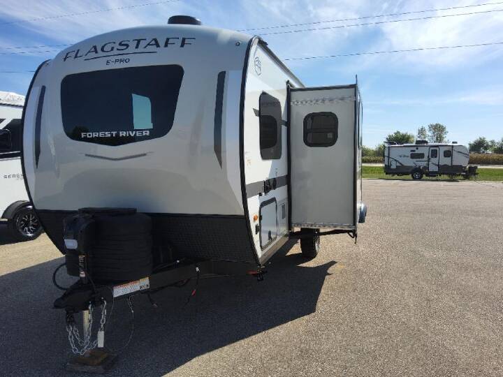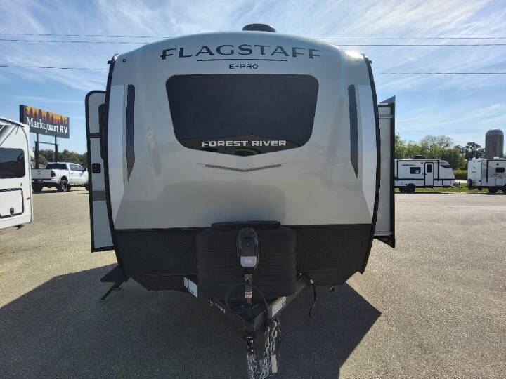This spacious bunk trailer will work perfectly for a family or friend group that enjoys their own sleeping space, plus more floor space with the dinette slide out that can sleep one to two. There are two bunks so you or your kids can sleep. There is exterior storage for more outdoor gear, and interior storage found throughout. The cook will love having a pantry and overhead cabinets for snacks, canned goods, dishes and more. After making a warm meal, the 12V refrigerator can hold the leftovers. There is also a flip-down lavy sink in the full bath for added space when not in use! With any Flagstaff E-Pro travel trailer by Forest River, you will experience lightweight towing, style and features that will meet your needs, plus amenities that give you more than you expected! Built with interior and exterior composite sidewall construction for added strength and durability, a fully laminated roof for weather-tight protection, and aluminum truss roof bracing for enhanced stability. These trailers are equipped with Dexter leaf-spring axles for smooth towing and durable performance. The interior features an aluminum dinette, bed, and bunk, providing a strong and lightweight framework for comfortable living. Additionally, the backup camera prep ensures a safe and stress-free reversing experience. Make your selection today!