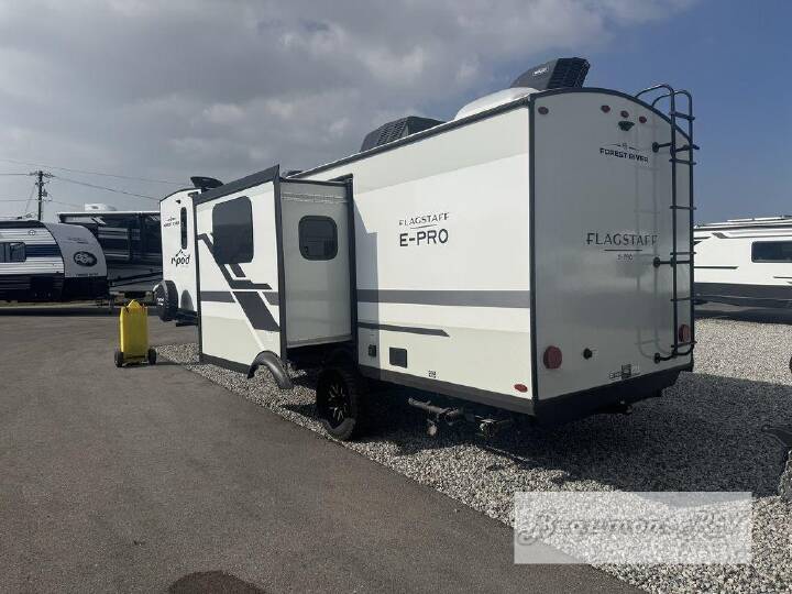 This spacious bunk trailer will work perfectly for a family or friend group that enjoys their own sleeping space, plus more floor space with the dinette slide out that can sleep one to two. There are two bunks so you or your kids can sleep. There is exterior storage for more outdoor gear, and interior storage found throughout. The cook will love having a pantry and overhead cabinets for snacks, canned goods, dishes and more. After making a warm meal, the 12V refrigerator can hold the leftovers. There is also a flip-down lavy sink in the full bath for added space when not in use! With any Flagstaff E-Pro travel trailer by Forest River, you will experience lightweight towing, style and features that will meet your needs, plus amenities that give you more than you expected! Built with interior and exterior composite sidewall construction for added strength and durability, a fully laminated roof for weather-tight protection, and aluminum truss roof bracing for enhanced stability. These trailers are equipped with Dexter leaf-spring axles for smooth towing and durable performance. The interior features an aluminum dinette, bed, and bunk, providing a strong and lightweight framework for comfortable living. Additionally, the backup camera prep ensures a safe and stress-free reversing experience. Make your selection today!
