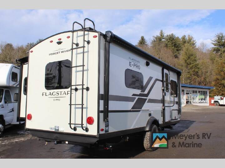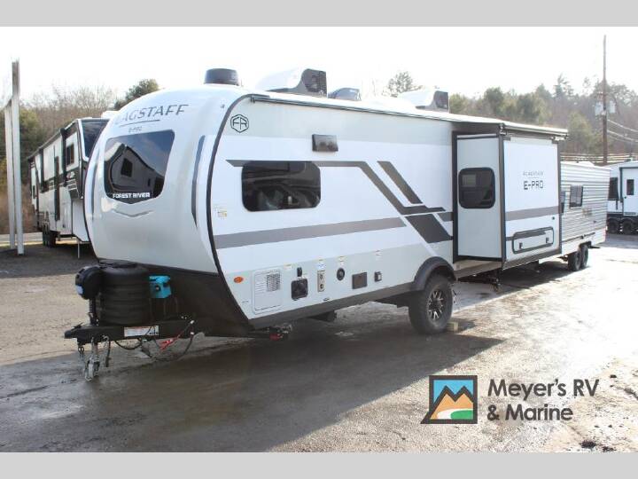 Unwind and relax in style, with plenty of storage space to keep you organized. The rear bedroom is a peaceful retreat, featuring a queen bed, spacious wardrobe, desk, and TV. The walkthrough bathroom is a practical and refreshing space, with a linen closet to keep your towels and toiletries tidy. Plus, the kitchen is equipped with a fridge, convection microwave, dinette, sink, and overhead cabinets, so you can prepare delicious meals and snacks with ease and enjoy quality time with loved ones. With any Flagstaff E-Pro travel trailer by Forest River, you will experience lightweight towing, style and features that will meet your needs, plus amenities that give you more than you expected! Built with interior and exterior composite sidewall construction for added strength and durability, a fully laminated roof for weather-tight protection, and aluminum truss roof bracing for enhanced stability. These trailers are equipped with Dexter leaf-spring axles for smooth towing and durable performance. The interior features an aluminum dinette, bed, and bunk, providing a strong and lightweight framework for comfortable living. Additionally, the backup camera prep ensures a safe and stress-free reversing experience. Make your selection today! DEALER DISCOUNT; SUNSET SEEKER PACKAGE; SLIDE TOPPER; PROGRAM DISCOUNT