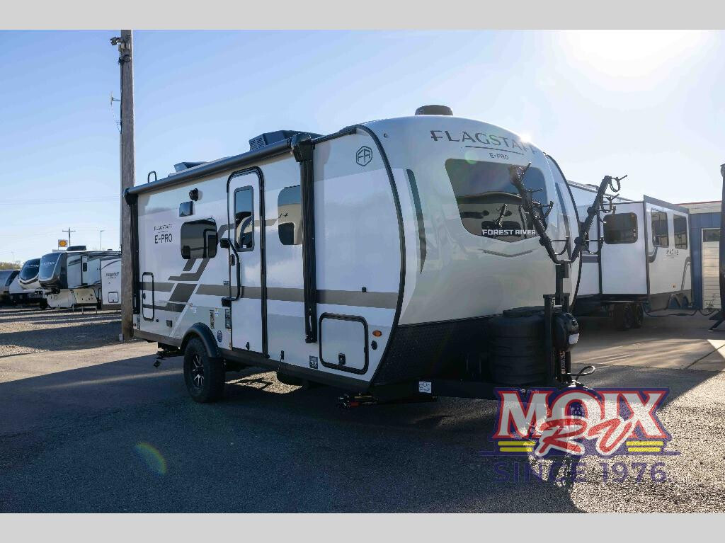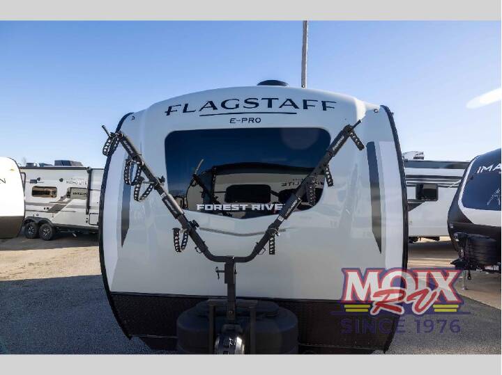 Get ready for a spacious and comfortable trip in this trailer, plus you will have a convenient rear full bathroom with an oversized shower and linen storage to utilize instead of using the campground's facilities. The walk-around full bed gives you two sides with wardrobes to claim as your own. And the kitchen offers full amenities to make meals. You can relax, dine, or even work from the slide out sofa with a 30" x 15" table and watch the TV. You will find storage along the exterior for your outdoor gear, plus a 14' power awning. With any Flagstaff E-Pro travel trailer by Forest River, you will experience lightweight towing, style and features that will meet your needs, plus amenities that give you more than you expected! Built with interior and exterior composite sidewall construction for added strength and durability, a fully laminated roof for weather-tight protection, and aluminum truss roof bracing for enhanced stability. These trailers are equipped with Dexter leaf-spring axles for smooth towing and durable performance. The interior features an aluminum dinette, bed, and bunk, providing a strong and lightweight framework for comfortable living. Additionally, the backup camera prep ensures a safe and stress-free reversing experience. Make your selection today! RVIA SEAL; SUNSET SEEKER PACKAGE; TONGUE MOUNT BIKE RACK