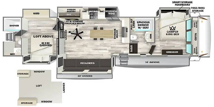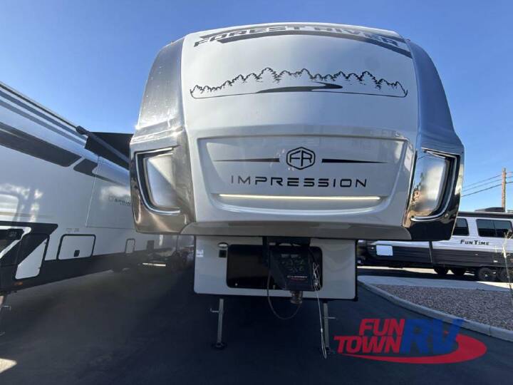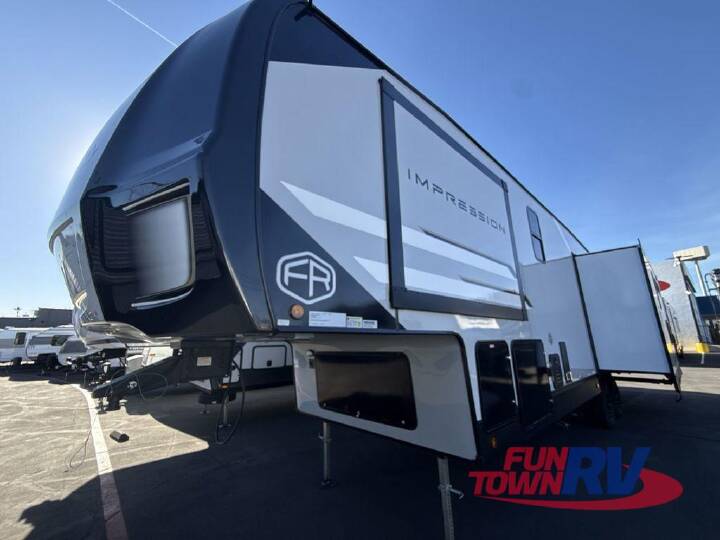 Step inside this luxurious fifth wheel that can sleep five each night! The rear tri-fold hide-a-bed sofa and theater seating provide a relaxing evening by the entertainment center with a 55" TV. Next to the entertainment center is a hidden door with cabinets and 16 cu. ft. 12V refrigerator, and a 36" x 74" flip-down bunk with storage. The kitchen has plenty of countertop space to prepare your best home cooked meals and an island with four bar stools to enjoy your meals. You also have a desk with storage to get some work done if needed. As you walk up the floating steps, you will notice the full bathroom to your left with a walk-in shower with a skylight for added natural lighting and a dual sink vanity for two to get ready at once. The front private bedroom has a king bed with Versa Tilttechnology slide, a dresser next to a bench and a front wardrobe that is prepped for a washer and dryer! With any Impression mid-profile fifth wheel by Forest River, the focus of the design is comfort and value, built with quality craftsmanship and attention to customer's desires in each Impression! The exterior includes upgraded E-rated tires, custom exterior graphics package, and insulated slam latch baggage doors. There is also an enclosed docking station, an outside shower, and a 100W roof solar panel for off-grid capabilities. The fully heated and enclosed AccessiBelly has removable underbelly panels and offers four seasons of travel, and there is an industry leading 15K A/C plus 35K BTU furnace to keep you comfortable. The interior has lumbercore cabinetry, residential linoleum, residential backsplash in the kitchen, and oversized opening windows in the living area for more natural lighting and good air flow. INCLUDES - FTRV QUALITY ASSURANCE / CAMP READY PKG; INCLUDES - DEALER PREP; NO HIDDEN FEES; LUXURY PACKAGE; 2ND 15K DUCTED A/C; OFF GRID PACKAGE; COMFORT PACKAGE; 4 POINT AUTO LEVEL; DIAMOND PACKAGE