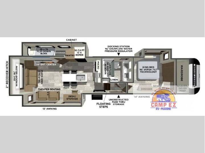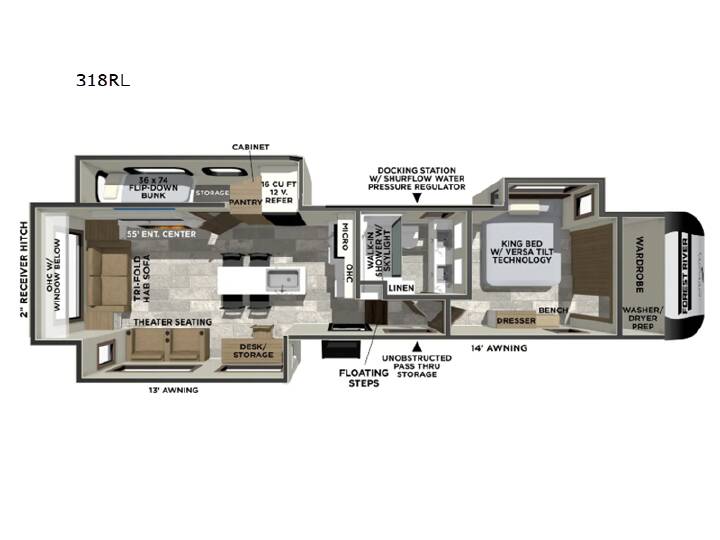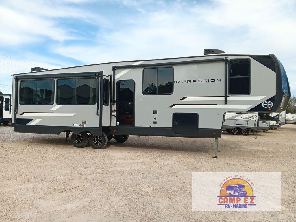 Step inside this luxurious fifth wheel that can sleep the whole gang each night! The rear tri-fold hide-a-bed sofa and theater seating provide a relaxing evening by the entertainment center with a TV. Next to the entertainment center is a hidden door with cabinets and 16 cu. ft. 12V refrigerator, and a 36" x 74" flip-down bunk with storage. The kitchen has plenty of countertop space to prepare your best home cooked meals and an island with four bar stools to enjoy your meals. You also have a desk with storage to get some work done if needed. As you walk up the floating steps, you will notice the full bathroom to your left with a walk-in shower with a skylight for added natural lighting and a dual sink vanity for two to get ready at once. The front private bedroom has a king bed with Versa Tilttechnology slide, a dresser next to a bench and a front wardrobe that is prepped for a washer and dryer! With any Impression fifth wheel by Forest River, the focus of the design is comfort and value, built with quality craftsmanship and attention to customer's desires in each Impression! The exterior includes upgraded E-rated tires, custom exterior graphics package, and insulated slam latch baggage doors. There is also an enclosed docking station, an outside shower, and a 100W roof panel for off-grid capabilities. The fully heated and enclosed AccessiBelly has removable underbelly panels along with enclosed tank valves. There is an industry leading 15K A/C plus 35K BTU furnace to keep you comfortable. The interior has lumbercore cabinetry, residential linoleum, residential backsplash in the kitchen, and oversized opening windows in the living area for more natural lighting and good air flow.