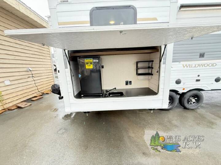 With this triple-slide Wildwood travel trailer, everyone can have their own space! The privatebunkhouse features dual opposing slides that provide tons of space for the kids to play. The large slide in the living area opens up the whole space, and here you'll find a Versa Lounge with Versa Flex table which is perfect for meal times and relaxing. You'll love the front private bedroom with a custom king bed with Versa-Tilt, and everyone will appreciate the full bath with walk-in shower. The chef of the family can cook a meal on the cooktop, or you can prepare hamburgers at the outside kitchen that you are sure to love! The Wildwood travel trailers are packed with hassle-free camping amenities! There are a variety of floorplans to choose from so you can find the layout that best fits your needs. The heated and enclosed Accessibelly will help protect against the elements and debris during transport, and the exterior retro/metal redesign is sure to be eye-catching! There are stylish roller shades inside, along with updated backsplash, elegant curtain rods and curtains, plus many more interior comforts! Choose a Wildwood travel trailer today for quality and value! Call 1-902-639-1509 for your best-case scenarios and our multiple payment solutions.