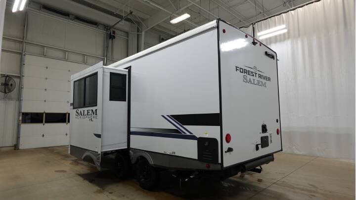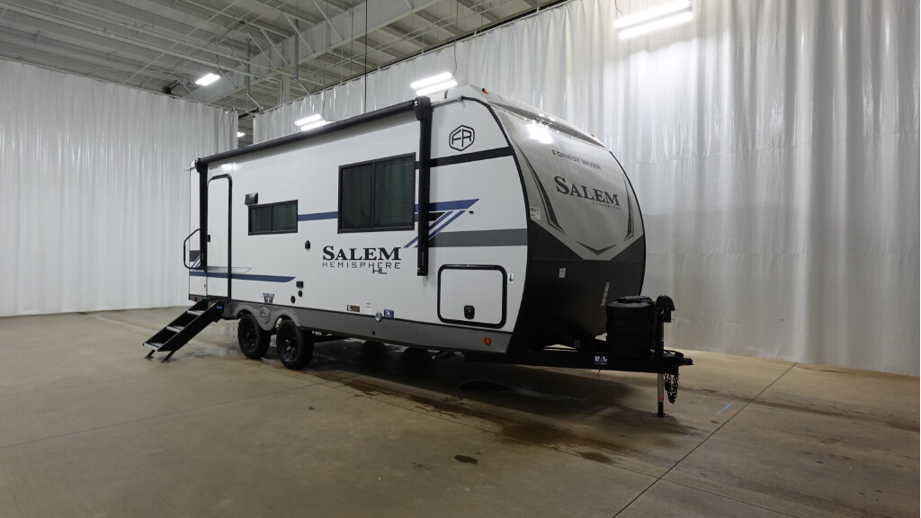 NEW 2026 FOREST RIVER SALEM-HEM 21RBHL - 345989, Forest River Salem Hemisphere Hyper-Lyte travel trailer 21RBHL highlights: Front Bed Area Rear Corner Bath Panoramic Windows Carpet Free At the front of this thoughtfully designed trailer, a comfortable 60" x 80" queen bed provides a restful retreat, complete with overhead cabinets for storing your essentials and adventure gear. Moving into the center, the L-shaped kitchen impresses with elegant temple cherry cabinetry, Nordic marble countertops, and a residential-style single-bowl undermount sink, while a convenient bar with stools at the end offers a cozy spot to enjoy meals or morning coffee. Across from the kitchen, a slide-out adds generous space and features theater seating where you can relax and take in the views through large panoramic windows. At the rear, a 10-cu. ft. refrigerator and pantry keep all your groceries and dry goods organized, and just opposite, a full bathroom ensures you can freshen up without relying on campsite facilities. With any Salem Hemisphere Hyper-Lyte travel trailer by Forest River, you will appreciate a wide stance axle and laminated "Aluma Frame" sidewalls and floor for added durability. There are also square windows with built-in shades with reflecting thermal-foil backing to help keep your trailer cool during the summer. The 2" accessory hitch receiver will allow you to bring along more camp gear, and the tankless water heater is a feature you won't want to camp without! Inside, you'll find Temple Cherry cabinetry, wood door casings in place of plastic, a residential single bowl undermount sink, and many more comforts. Outside, your furry friend will be happy with the shaded pet tether and security hook, and there is even an outside shower with hot and cold water to fill the dogs water bowl and wash off hiking boots!