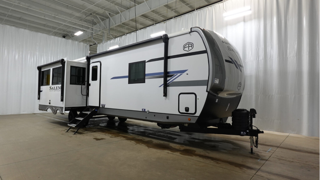 NEW 2026 FOREST RIVER SALEM-HEM 301FAM - 346017, **Forest River Salem Hemisphere travel trailer 301FAM highlights:** * Front Private Bedroom * Outside Kitchen * Hidden Storage behind 50" TV * Four Bunk Beds This is the perfect travel trailer if you enjoy camping with a larger group! The rear private bunkhouse includes four bunk beds plus a dresser to keep this space tidy. You'll have the queen bed slide out in the front bedroom all to yourselves, along with a dresser and an ottoman, plus a front wardrobe with washer/dryer prep. Everyone can meet in the combined kitchen and living area that includes spacious theater seating, a kitchen island with four chairs, full kitchen amenities, and dual opposing slides for more space! The Salem Hemisphere travel trailers by Forest River are packed with features, while still being value-minded! Each model is constructed with laminated "Aluma Frame" sidewalls and floor with block foam insulation plus an enclosed underbelly with 12V tank heaters on all holding tanks. There are LED awning, marker and taillights outside, along with an extra-large pass-thru storage with slam latch baggage doors, plus solar prep and Lippert On-The-Go ladder prep. The 60K on-demand tankless water heater will provide endless hot showers, and the JBL sound system includes a head unit plus interior and exterior speakers to keep the party going. There are also many interior comforts found throughout that will make you feel right at home!