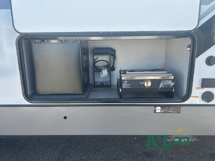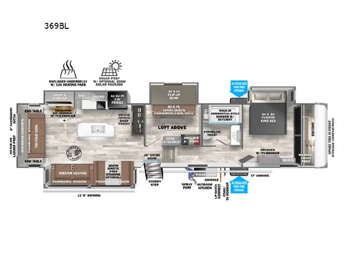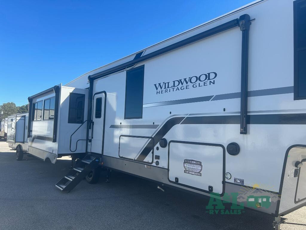 Imagine having your own master bedroom with a customking bed, a full-width wardrobe, plus washer and dryer prep in this Wildwood Heritage Glen fifth wheel. You might even use the bench to put on your slippers before heading to the bathroom to get cleaned up in the residential walk-in shower. Your kids or friends can sleep in the middle bunkhouse that has a flip-up bunk, a Versa queen convertible sofa bed, and a loft above. You might also utilize this room as an office thanks to the desk. The chef will love all the appliances, the kitchen island, the deluxe French door pantry, and the 16-cu. ft. 12V refrigerator. There is also plenty of seating on all the furniture, and the cupholders in the theatre seats are handy. With any Wildwood Heritage Glen fifth wheel by Forest River, the quality construction, attention to detail and design along with a bright and welcoming interior allows you to relax in comfort. You'll love the high-end solid surface countertops included in the Elevated Value Package, along with a JBL sound system, full-length barreled ceilings, and an ultimate interior lighting upgrade. The included Expedition Package features an Accesibelly underbelly panel with 12V tank heaters, nitrogen-filled tires with aluminum rims, and a spacious 30" wide main entry door with a window. The Lippert On-The-Go ladder prep and back-up camera prep let you customize your fifth wheel even more, and the LED awning, front cap, marker and taillights will make it easier than ever to set up camp!