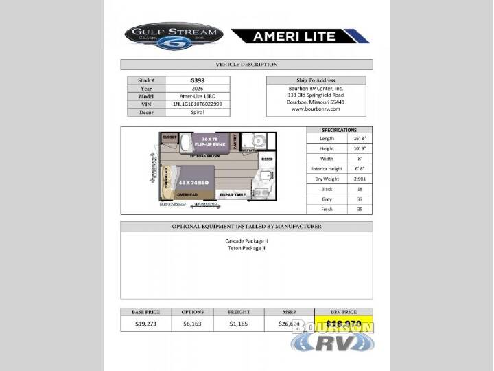 2026 Gulf Stream RV Ameri-Lite Super Lite 16RD, Ameri-Lite... Ultra-Lite & Ultra-Fun Since 1983, Gulf Stream has been a dominate force in the RV industry. High quality construction, functional floorplans, and affordable pricing have made Gulf Stream RVs stand out from the competition for over thirty years.Ameri-Lite travel trailers deliver top quality construction, roomy, comfortable accommodations, and well-proven floor plans inspired by people who know how to enjoy the outdoors. New model for 2026! The Gulf Stream Ameri-Lite 16RD is grabbing a lot of attention in the RV circles, and it is easy to see why. Obviously this is a compact, ultra-lite weight camper, but you will be pleasantly surprised how well Gulf Stream utilized the limited space this model has.First off, this is a rear door trailer which makes sense for a compact camper. This allows the sides of the trailer to be better utilized for windows, sleeping areas, etc. You are surrounded by windows in the RV, which is a plus since the 16RD is small by design and helps the unit to "feel" bigger. A full size queen bed, a jack-knife sofa, and a flip up bunk give this compact trailer room to sleep 4. This little guy even has two awnings! Easily towable by most SUVs and small trucks. Backed by Gulf Stream's three-year warranty.OPTIONS Cascade Package IITeton Package IIWhite Metal w/ Smooth FrontRVIA Seal Gulf Stream Ameri-Lite Super Lite 16RD Highlights: