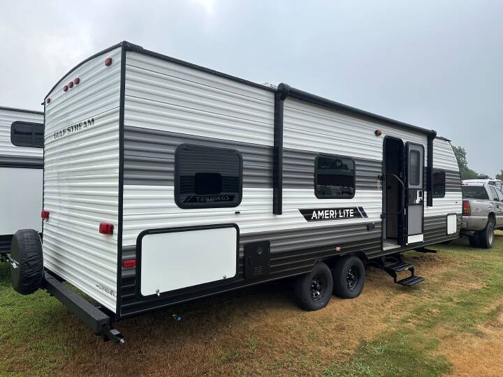 The Ameri-Lite Ultra Lite travel trailers by Gulf Stream are the perfect RV for families wanting to start their camping lifestyle, but not break the bank. These lightweight units are built with a diamond plate lower front, a one-piece synthetic vinyl roof, and a uni-body construction with steel hurricane straps tying the walls to the floor for added durability. The front power hitch jack and four stabilizer jacks will make set-up hassle-free once you arrive at the campground, and you can put out the electric awning to rest in the shade when you're done. Each model includes convenient amenities, like the 13,500 BTU A/C, the tankless water heater, a central control panel, and multiple USB ports for your tablet, phone, and camera! The inside is designed to make you feel at home with radiant LED lighting, designer kitchen backsplash, pleated privacy shades, craft-made cabinetry, plus many more features. Start your RV lifestyle with an affordable, lightweight Ameri-Lite Ultra Lite travel trailer today!