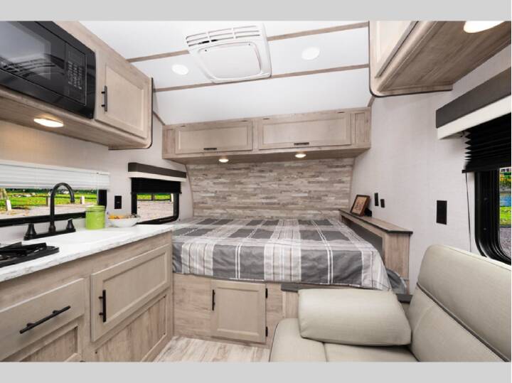 You and your spouse will love camping in this travel trailer! The sofa allows you to have an overnight guest, and you'll find plenty of storage in the overhead cabinets, the cabinet under bed, and in the outside trunk. The chef of the family can prepare dinner on the two-burner cooktop, and clean-up will be a breeze with the high-rise kitchen faucet. You will appreciate the neo-angled shower in the rear corner bathroom to clean up everyday, and the 54" x 80" bed will provide a great night's rest so that you're ready for each adventure! If you're looking for an affordable, lightweight travel trailer, you've found it in the Ameri-Lite Super Lite by Gulf Stream. These models may be lighter in weight, but they don't skimp out on comfortable features. Each unit includes high-performance vinyl flooring throughout, a white kitchen sink, craft-made cabinetry with designer pulls, plus fabric-wrapped box valances to make you feel right at home. You'll enjoy the 6' 8" interior height, wood ceiling trim, multiple USB ports, and more features included within the Camping Package. These models also include a tankless water heater, a central control panel to control your unit's functions, plus plenty of safety features you are sure to appreciate for your family. You can't go wrong with an Ameri-Lite Super Lite travel trailer. Choose your favorite floorplan today!