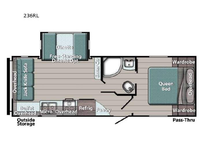 Camping with friends has never been so easy than in this cozy travel trailer. Once you arrive at your destination, prepare lunch on the three burner cooktop and you can dine at the booth dinette. Your guest can make this area their bed at night, along with the jack knife sofa. There is a front master bedroom with a queen bed that will feel just like home, and the two wardrobes provide a place for all your clothes. Head outside to find a pass-through storage, additional outside storage, plus an electric awning with LED lights!