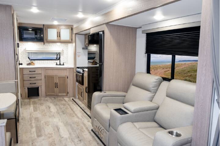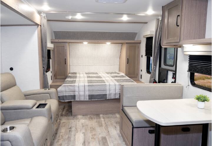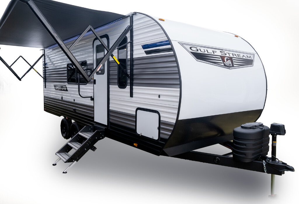 2026 Gulf Stream RV Ameri-Lite Ultra Lite 240RK, Gulf Stream Ameri-Lite Ultra Lite travel trailer 240RK highlights: This travel trailer is perfect for you and your partner, thanks to the queen bed, which is ideal for sleeping and resting peacefully, beside it you will find a shirt closet and wardrobe to store your belongings. You can rest a bit on the theater seating or also have a chit-chat with your partner. Conveniently cook delicious food thanks to the kitchen which includes a refrigerator, three cooktop burners, microwave, and sink.  After the food is done, you can comfortably have lunch at the 38' dinette while watching the TV. This unit is also fitted with a lot of space to store different things like pass-thru storage, overhead cabinets, pantry, and linen. Finally, take a relaxing bath in the incredible full bathroom with a skylight above the shower. The Ameri-Lite Ultra Lite travel trailers by Gulf Stream are the perfect RV for families wanting to start their camping lifestyle, but not break the bank. These lightweight units are built with a diamond plate lower front, a one-piece synthetic vinyl roof, and a uni-body construction with steel hurricane straps tying the walls to the floor for added durability. The front power hitch jack and four stabilizer jacks will make set-up hassle-free once you arrive at the campground, and you can put out the electric awning to rest in the shade when you're done. Each model includes convenient amenities, like the 13,500 BTU A/C, the tankless water heater, a central control panel, and multiple USB ports for your tablet, phone, and camera! The inside is designed to make you feel at home with radiant LED lighting, designer kitchen backsplash, pleated privacy shades, craft-made cabinetry, plus many more features. Start your RV lifestyle with an affordable, lightweight Ameri-Lite Ultra Lite travel trailer today!