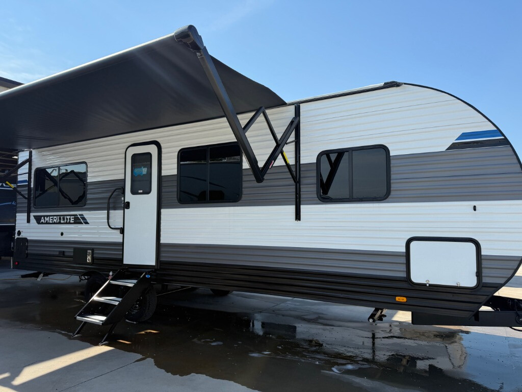 Designed with luxury and convenience in mind, this stunning RV offers the perfect blend of relaxation and excitement. The living room/kitchen area is the heart of the home, featuring a refrigerator, dinette, three-burner stove ideal for cooking your favorite meals, overhead cabinets, pantry, theater seating, and entertainment center. Perfect for having fun with friends and family, or simply relaxing and enjoying the comforts of home. The front bedroom boasts a queen bed, wardrobe, and shirt closet for all your favorite clothes and belongings. The full bathroom is a tranquil oasis, complete with a shower with skylight for added natural light. The perfect place to freshen up and feel at home. The Ameri-Lite Ultra Lite travel trailers by Gulf Stream are the perfect RV for families wanting to start their camping lifestyle, but not break the bank. These lightweight units are built with a diamond plate lower front, a one-piece synthetic vinyl roof, and a uni-body construction with steel hurricane straps tying the walls to the floor for added durability. The front power hitch jack and four stabilizer jacks will make set-up hassle-free once you arrive at the campground, and you can put out the electric awning to rest in the shade when you're done. Each model includes convenient amenities, like the 13,500 BTU A/C, the tankless water heater, a central control panel, and multiple USB ports for your tablet, phone, and camera! The inside is designed to make you feel at home with radiant LED lighting, designer kitchen backsplash, pleated privacy shades, craft-made cabinetry, plus many more features. Start your RV lifestyle with an affordable, lightweight Ameri-Lite Ultra Lite travel trailer today!
