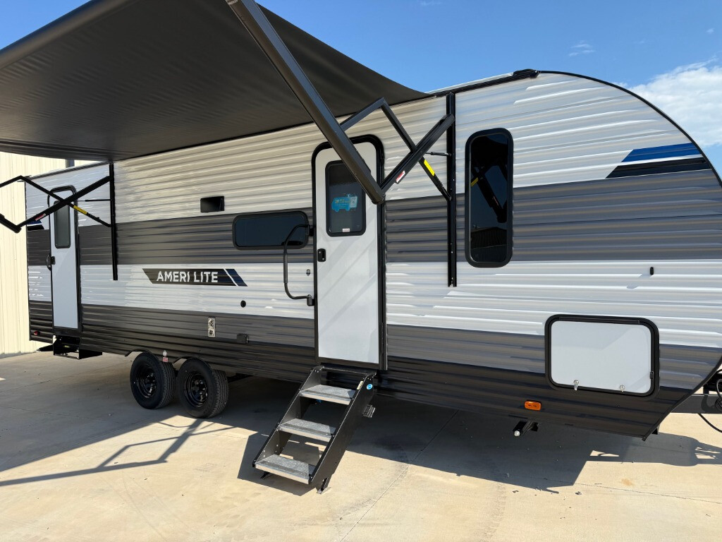 A trip to the lake or your favorite state park just got better in this comfortable travel trailer. Whether you're relaxing on the sofa or booth dinette, cooking in the spacious kitchen, or sitting outside under the electric awning with LED lights, you will enjoy every minute you camp. You and your spouse will have a private bedroom up front with a queen bed and dual wardrobes, and there are double-size bunks for the kids or your friends! The Ameri-Lite Ultra Lite travel trailers by Gulf Stream are the perfect RV for families wanting to start their camping lifestyle, but not break the bank. These lightweight units are built with a diamond plate lower front, a one-piece synthetic vinyl roof, and a uni-body construction with steel hurricane straps tying the walls to the floor for added durability. The front power hitch jack and four stabilizer jacks will make set-up hassle-free once you arrive at the campground, and you can put out the electric awning to rest in the shade when you're done. Each model includes convenient amenities, like the 13,500 BTU A/C, the tankless water heater, a central control panel, and multiple USB ports for your tablet, phone, and camera! The inside is designed to make you feel at home with radiant LED lighting, designer kitchen backsplash, pleated privacy shades, craft-made cabinetry, plus many more features. Start your RV lifestyle with an affordable, lightweight Ameri-Lite Ultra Lite travel trailer today!