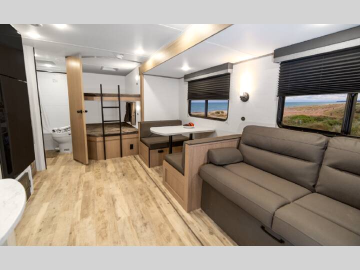A trip to the lake or your favorite state park just got better in this comfortable travel trailer. Whether you're relaxing on the sofa or booth dinette, cooking in the spacious kitchen, or sitting outside under the electric awning with LED lights, you will enjoy every minute you camp. You and your spouse will have a private bedroom up front with a queen bed and dual wardrobes, and there are double-size bunks for the kids or your friends! The Ameri-Lite Ultra Lite travel trailers by Gulf Stream are the perfect RV for families wanting to start their camping lifestyle, but not break the bank. These lightweight units are built with a diamond plate lower front, a one-piece synthetic vinyl roof, and a uni-body construction with steel hurricane straps tying the walls to the floor for added durability. The front power hitch jack and four stabilizer jacks will make set-up hassle-free once you arrive at the campground, and you can put out the electric awning to rest in the shade when you're done. Each model includes convenient amenities, like the 13,500 BTU A/C, the tankless water heater, a central control panel, and multiple USB ports for your tablet, phone, and camera! The inside is designed to make you feel at home with radiant LED lighting, designer kitchen backsplash, pleated privacy shades, craft-made cabinetry, plus many more features. Start your RV lifestyle with an affordable, lightweight Ameri-Lite Ultra Lite travel trailer today!