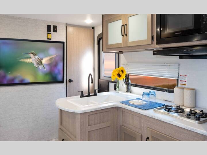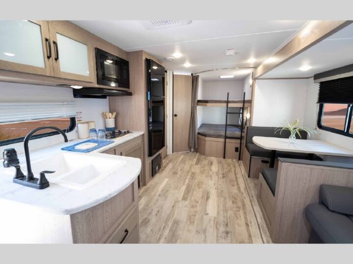 Invite more along with double-size bunks in this 'Show Stopper' travel trailer! The private shower and toilet is close to the bunks if you're camping with little ones making it quite convenient, especially at night. You will be comfortable on the front RV queen bed with dual bedside nightstands and shirt closets. The kitchen features everything you need to create meals and snacks for your entire family, and the outside pass-through storage allows you to easily tuck away your gear like fishing poles, camp chairs and games, plus more! The Ameri-Lite Ultra Lite travel trailers by Gulf Stream are the perfect RV for families wanting to start their camping lifestyle, but not break the bank. These lightweight units are built with a diamond plate lower front, a one-piece synthetic vinyl roof, and a uni-body construction with steel hurricane straps tying the walls to the floor for added durability. The front power hitch jack and four stabilizer jacks will make set-up hassle-free once you arrive at the campground, and you can put out the electric awning to rest in the shade when you're done. Each model includes convenient amenities, like the 13,500 BTU A/C, the tankless water heater, a central control panel, and multiple USB ports for your tablet, phone, and camera! The inside is designed to make you feel at home with radiant LED lighting, designer kitchen backsplash, pleated privacy shades, craft-made cabinetry, plus many more features. Start your RV lifestyle with an affordable, lightweight Ameri-Lite Ultra Lite travel trailer today!