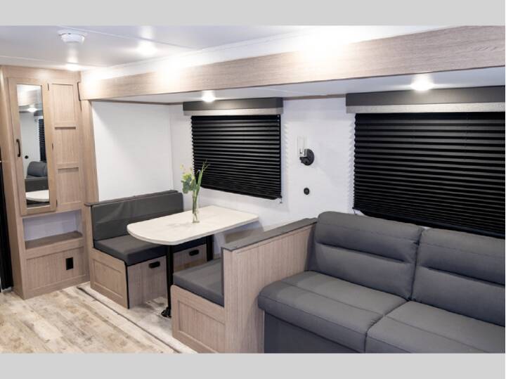 Are you ready for camping adventures with the whole family? Or maybe you enjoy getaways to the lake with friends! This travel trailer includes a rear private bunkhouse with three bunks, plus a sofa below one of the bunks for space to relax. You can even add a TV here and there is a closet to hang clothes. The chef of your group can prepare meals on the three burner cooktop inside, and you can choose to add the optional outside 1/2 kitchen. You and your spouse will love being able to retreat to the front private bedroom each night, and there are dual wardrobes for your clothes and belongings. The Ameri-Lite Ultra Lite travel trailers by Gulf Stream are the perfect RV for families wanting to start their camping lifestyle, but not break the bank. These lightweight units are built with a diamond plate lower front, a one-piece synthetic vinyl roof, and a uni-body construction with steel hurricane straps tying the walls to the floor for added durability. The front power hitch jack and four stabilizer jacks will make set-up hassle-free once you arrive at the campground, and you can put out the electric awning to rest in the shade when you're done. Each model includes convenient amenities, like the 13,500 BTU A/C, the tankless water heater, a central control panel, and multiple USB ports for your tablet, phone, and camera! The inside is designed to make you feel at home with radiant LED lighting, designer kitchen backsplash, pleated privacy shades, craft-made cabinetry, plus many more features. Start your RV lifestyle with an affordable, lightweight Ameri-Lite Ultra Lite travel trailer today!