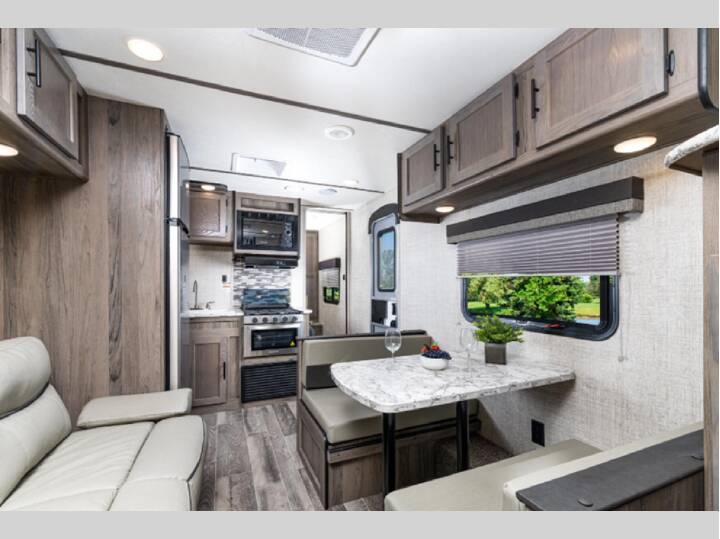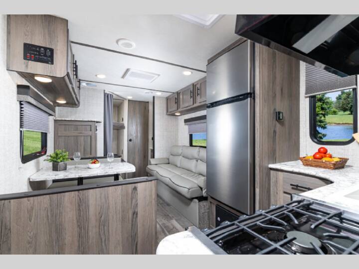 Check out this 'Show Stopper' travel trailer for eight! The cook will love the L-shaped counter in the kitchen area when whipping up meals and snacks for everyone. There is a cozy sofa and booth dinette allowing you to visit, relax, and dine with family and friends, plus both of these furnishings offer extra sleeping space. There is a wardrobe by the double-size bunks, and a bathroom sink just outside the private shower/tub and toilet room. The front bedroom allows you to get a great night's rest on a queenbed, and have plenty of storage for your things in the wardrobe and overhead storage, as well as having a nightstand for your cell phone. The Ameri-Lite Ultra Lite travel trailers by Gulf Stream are lightweight and economical, perfect for first time RVers! You will find solid construction, full bath and kitchen amenities, plus comfortable seating and sleeping spaces. There are also plenty of storage spaces for personal belongings, camp gear, food, and more!
