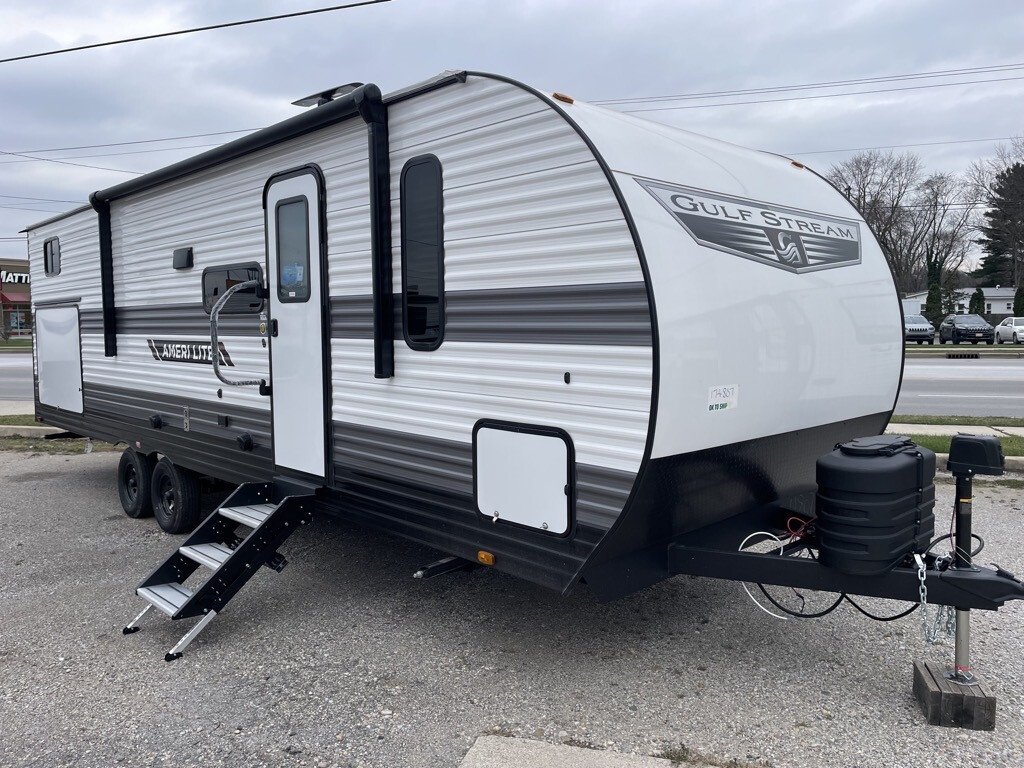 The Ameri-Lite Ultra Lite travel trailers by Gulf Stream are the perfect RV for families wanting to start their camping lifestyle, but not break the bank. These lightweight units are built with a diamond plate lower front, a one-piece synthetic vinyl roof, and a uni-body construction with steel hurricane straps tying the walls to the floor for added durability. The front power hitch jack and four stabilizer jacks will make set-up hassle-free once you arrive at the campground, and you can put out the electric awning to rest in the shade when you're done. Each model includes convenient amenities, like the 13,500 BTU A/C, the tankless water heater, a central control panel, and multiple USB ports for your tablet, phone, and camera!