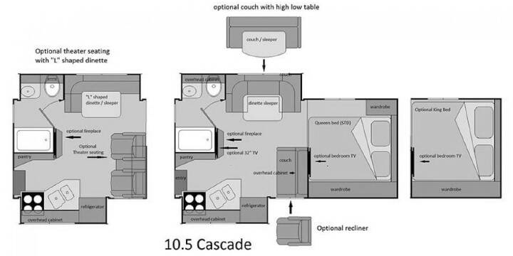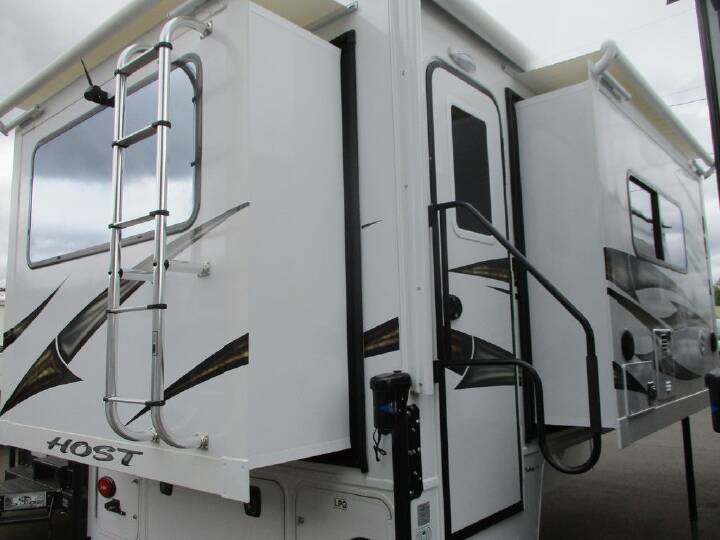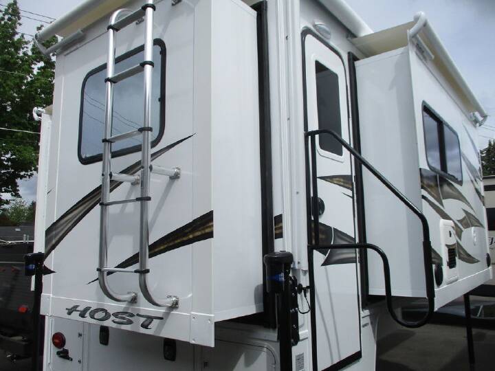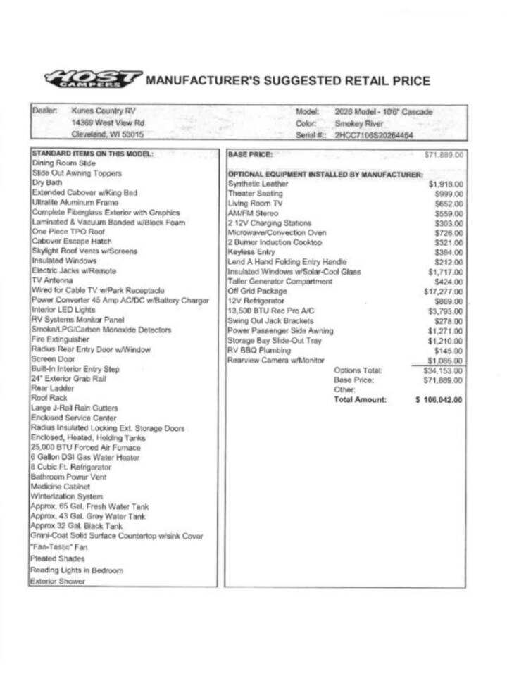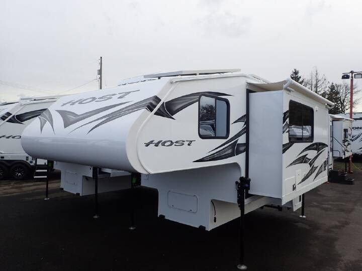 2026 Host Cascade 10.6, HOST CAMPERS CASCADE (2026) These Typical Features Vary by Model|4-Season Built Construction Ultralite 100% Aluminum Structure Vacuum-Bonded Foam Insulated Construction Fiberglass Exterior Seamless TPO Roofing Radius Insulated Locking Cargo Doors Interior Features Radius Insulated Glass Windows Duo Day Night Shades Clear View Blackout Cabinet Shaker Doors Grani-Coat Solid Surface Counter tops Large 3-Burner Range Double Door 2-Way 8cf Refrigerator Extended Cab with 60x80 Queen Bed 12v LED Interior Lighting System Adjustable Reading Lights in Bedroom MaxxFan Delux Fan Main Living Area Convenience Features Slide-Out Awning Toppers Radius Entry Door with Window Flush Mount Door Lock with Dead Bolt Screen Door with Kick Panel 24-inch Exterior Grab Rail 12v LED Patio Light w/Interior Switch 12v LED Outside Area Lighting LED Interior Lighting Skylight Roof Vents w/Screens Large J-Rail Rain Gutters Enclosed Service Center Clearance Lights Access Panels for Slide-Out Motors, Water Tank Holding Tanks 25k Forced Air Furnace 6-Gal Water Heater Built-in Interior Entry Step Enclosed, Heated Area for Holding Tanks Bathroom Power Vent Dry Bath with 24x38 shower Winterization System Exterior Shower Power Systems and Safety Features Recessed Taillights with Backup Lights Electric Jacks with Wireless Remote 45-Amp Power Converter Charger RV Systems Monitor Panel GFI Circuit Protection LP CO and Smoke Detectors Fire Extinguisher Heavy Duty Camper Tie Down Brackets Freeze Resistant 1/2-inch Color-Coded Water Lines