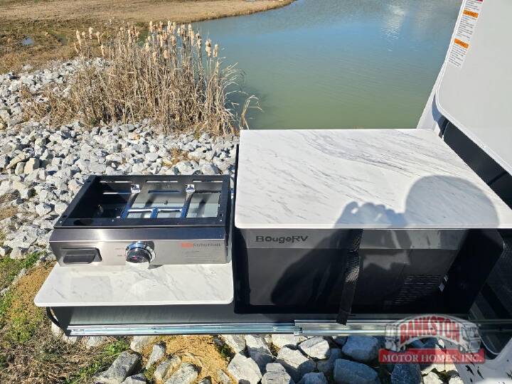 SLIDE OUT REAR KITCHEN WITH GRIDDLE; REFRIGERATOR COOLER ON EXTERIOR REAR KITCHEN; QUEEN BED (STANDARD); 200 WATT SOLAR PACKAGE