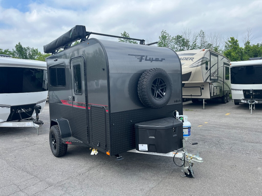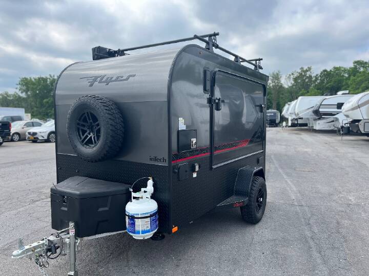 The inTech RV Flyer travel trailers and toy hauler expandables are ready for adventure whenever you are! With the all-aluminum, all-tube cage frame, the Flyer has been built with lightweight and long-lasting materials so that you can enjoy your unit for many, many years. The Flyer has a rugged design so that you can confidently explore new territory and go where traditional RVs cannot. The Flyer has a 2" rear receiver rated for 175 pounds which allows you to bring along your bikes, and the Bluetooth stereo has two speakers you can always have your best music playing. The optional roof rack will allow you to bring along kayaks, and there are more available options depending on the model you choose.