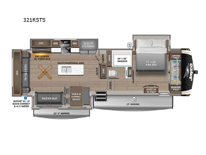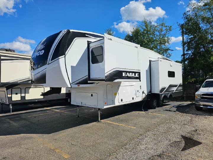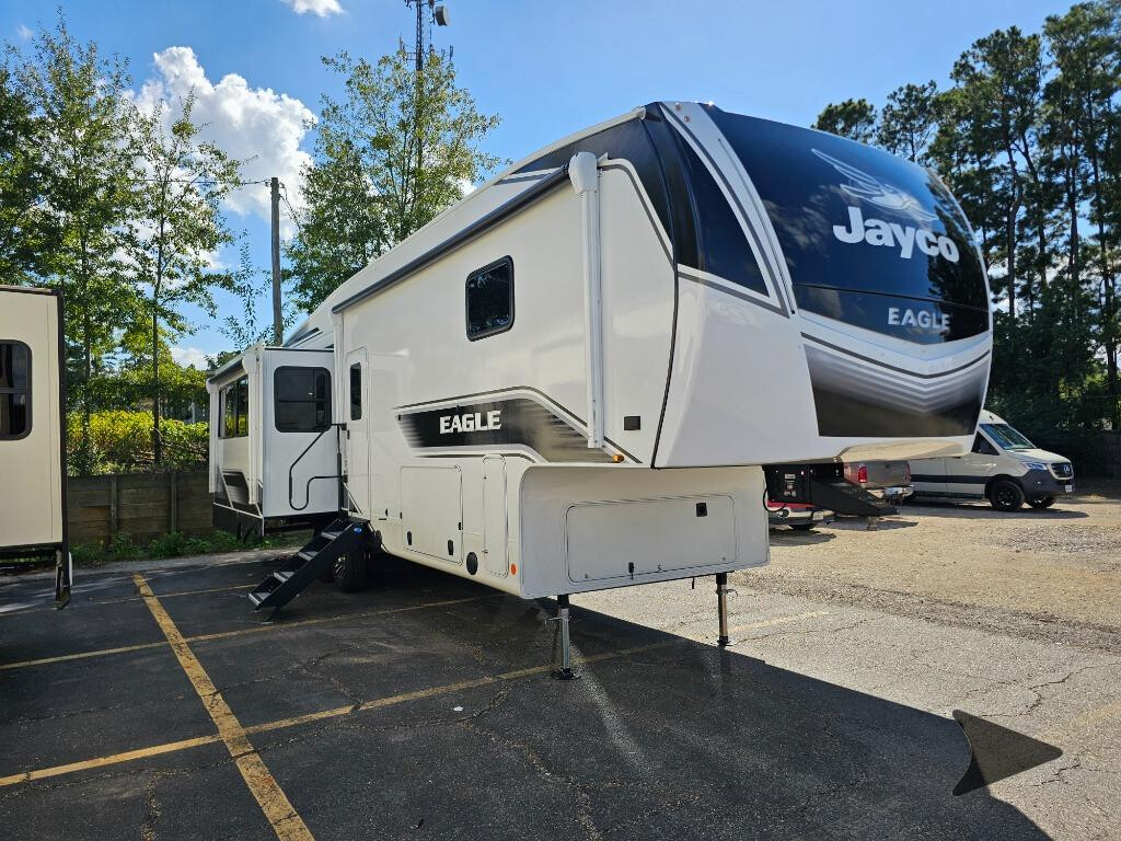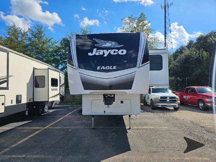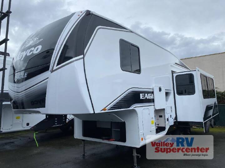 Triple slides for space, plenty of seating spaces, plus a spacious private bedroom make this fifth wheel one you won't want to pass up! You can freshen up each day in the full bath that includes a residential style glass shower door, a bathroom skylight, and a medicine cabinet to keep this space organized. Once you've cut up some fresh fruit at the kitchen island, whip up some eggs and bacon for breakfast, or just grab the cereal from the pantry. There is a spacious 16 cu. ft. 12V refrigerator, plus a hutch where you can store your own coffee machine. Relax on the tri-fold sofa, theater seat, or free-standing table with chairs/bench before heading out for the day. The king bed slide out in the front private bedroom will be waiting for you when you return! With any Eagle fifth wheel by Jayco you will appreciate durable construction materials, like the Magnum Truss Roof and the Stronghold VBL laminated walls. The JAYCOMMAND Smart RV system puts you in control of your RV's functions, and the 5 Star Handling Package will provide smooth towing from home to camp. Each model features Climate Shield zero-degree tested weather protection and the industry-exclusive HELIX cooling system that features two 15,000 BTU Whisper Quiet A/C's to keep you comfortable year around. Some of the exterior conveniences you are sure to love are the pass-through storage with Slam-Latch baggage doors and an automotive style front cap with max turn radius. The Eagle fifth wheels are designed to make you feel at home with solid hardwood slide fascia, residential vinyl flooring throughout, 100% no floor vents, and blackout roller shades with reflective side throughout for added privacy and insulation.