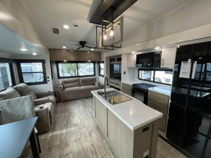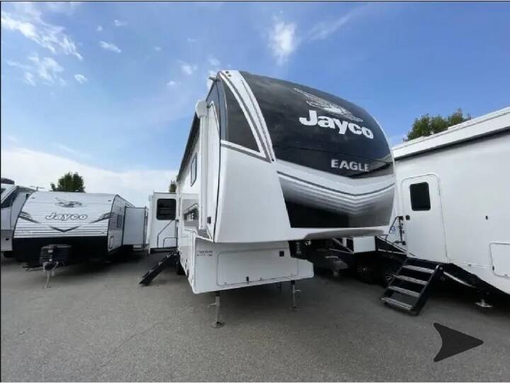 Triple slides for space, plenty of seating spaces, plus a spacious private bedroom make this fifth wheel one you won't want to pass up! You can freshen up each day in the full bath that includes a residential style glass shower door, a bathroom skylight, and a medicine cabinet to keep this space organized. Once you've cut up some fresh fruit at the kitchen island, whip up some eggs and bacon for breakfast, or just grab the cereal from the pantry. There is a spacious 16 cu. ft. 12V refrigerator, plus a hutch where you can store your own coffee machine. Relax on the tri-fold sofa, theater seat, or free-standing table with chairs/bench before heading out for the day. The king bed slide out in the front private bedroom will be waiting for you when you return! With any Eagle fifth wheel by Jayco you will appreciate durable construction materials, like the Magnum Truss Roof and the Stronghold VBL laminated walls. The JAYCOMMAND Smart RV system puts you in control of your RV's functions, and the 5 Star Handling Package will provide smooth towing from home to camp. Each model features Climate Shield zero-degree tested weather protection and the industry-exclusive HELIX cooling system that features two 15,000 BTU Whisper Quiet A/C's to keep you comfortable year around. Some of the exterior conveniences you are sure to love are the pass-through storage with Slam-Latch baggage doors and an automotive style front cap with max turn radius. The Eagle fifth wheels are designed to make you feel at home with solid hardwood slide fascia, residential vinyl flooring throughout, 100% no floor vents, and blackout roller shades with reflective side throughout for added privacy and insulation.